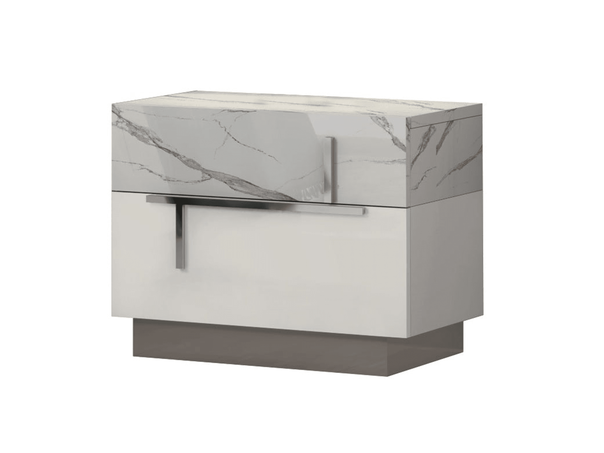 La camera da letto Sammy presenta un'esclusiva finitura in marmo di Carrara, il cui colore bianco e le strisce grigie si abbinano con gusto alla laccatura bianca lucida. Il marmo è un materiale di grande tendenza per l'arredamento, soprattutto negli stili moderni di metà secolo, e aggiunge movimento e ricchezza a questo design pulito e minimalista. La base argentata si abbina alla finitura delle maniglie, il cui design è reso distintivo dalle corte barre verticali e dal legame con le linee geometriche della testiera. Marmo bianco, colore bianco lucido e acciaio inossidabile sono finiture da sempre apprezzate nel design moderno.