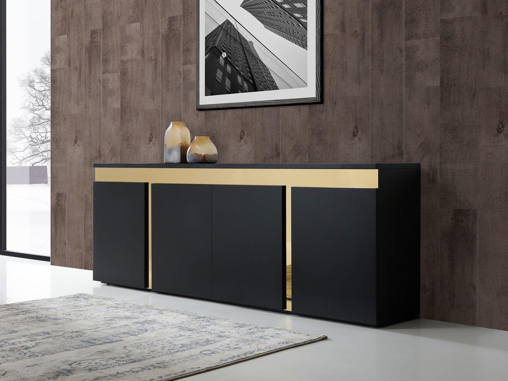 Questa credenza Zen in lacca nera lucida impreziosita da dettagli in acciaio inox dorato lucido è dotata di quattro ante e un ripiano in vetro. Un capolavoro di quella che viene definita una sala da pranzo di lusso.