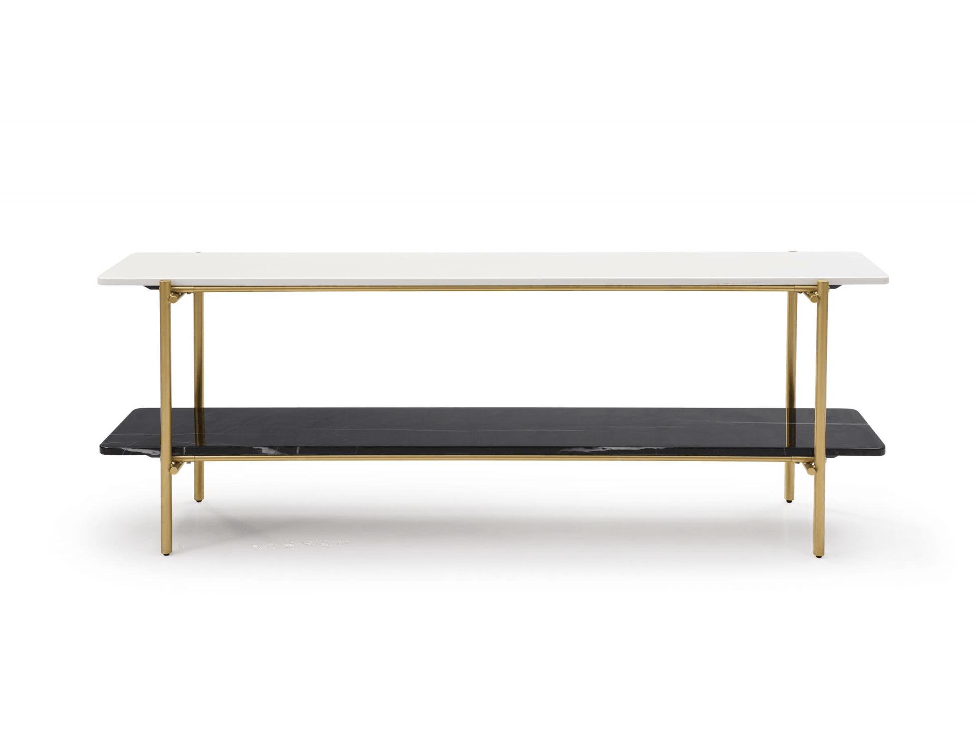 Questa consolle Ember è la definizione di design contemporaneo e glamour. Questo tavolo offre un bellissimo piano in marmo bianco cristallo lucido con un ripiano inferiore in marmo nero Marqués lucido. Le gambe sono realizzate in metallo con finitura oro. Questo tavolo è il tocco finale per qualsiasi stanza, può essere posizionato lungo una parete o dietro il divano. Può anche essere utilizzato come mobile porta TV sottile per risparmiare spazio.