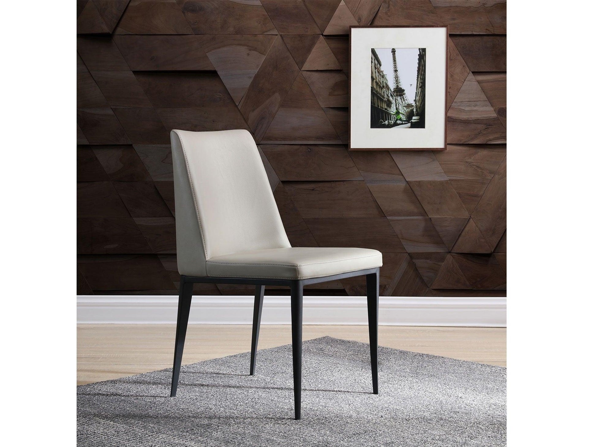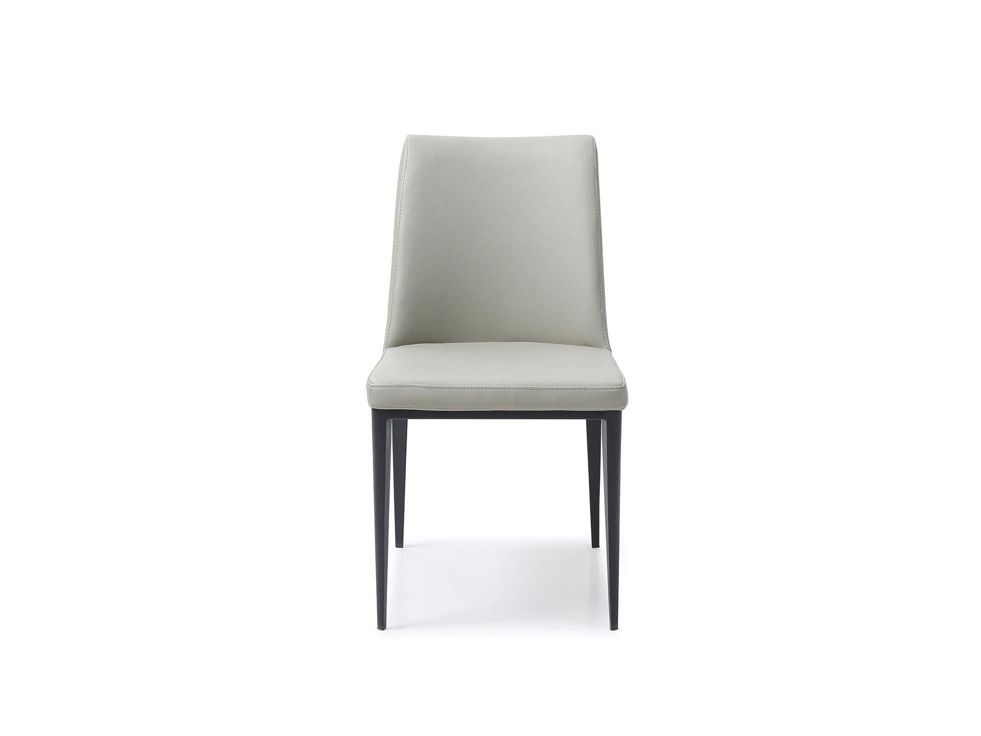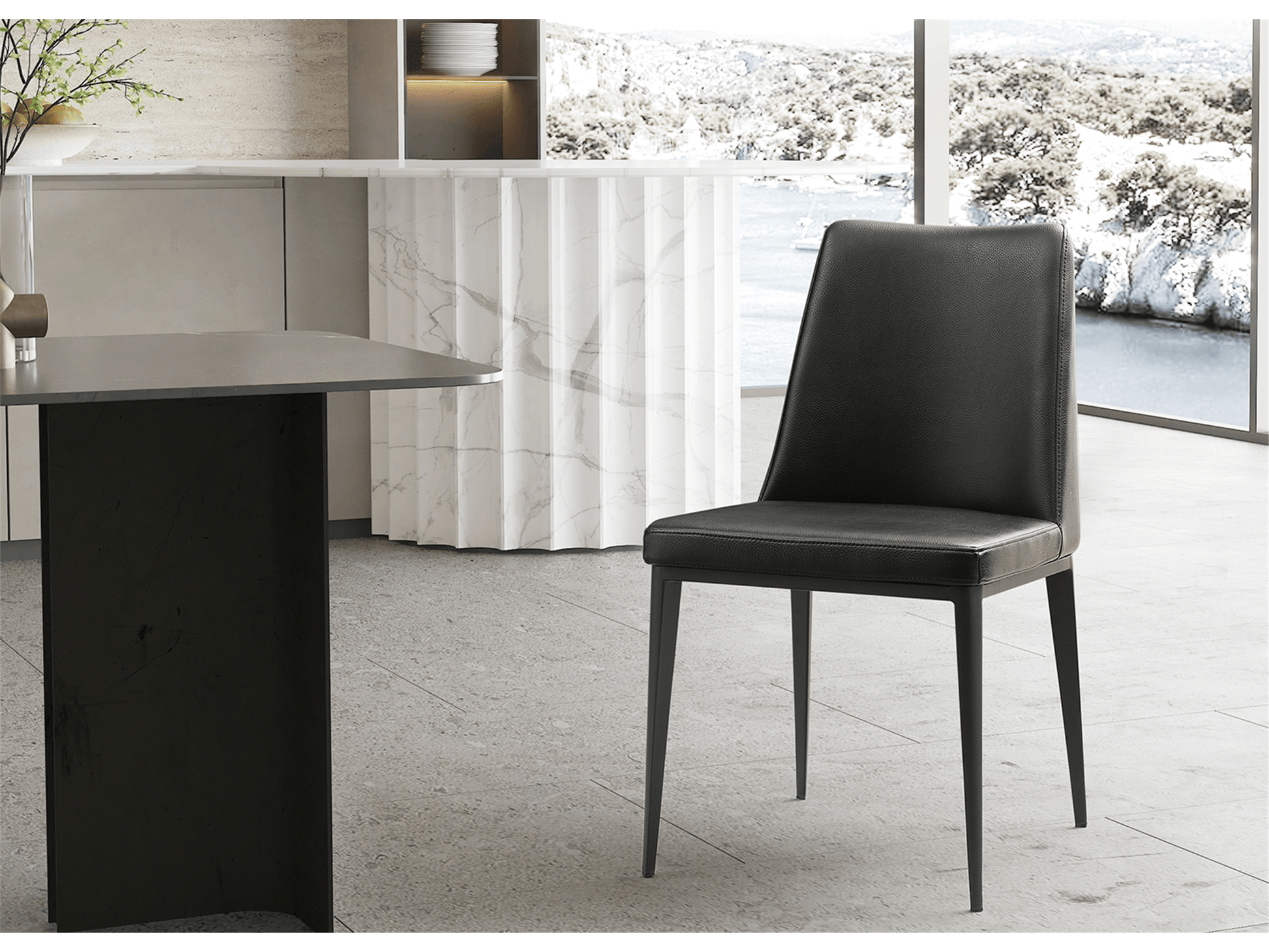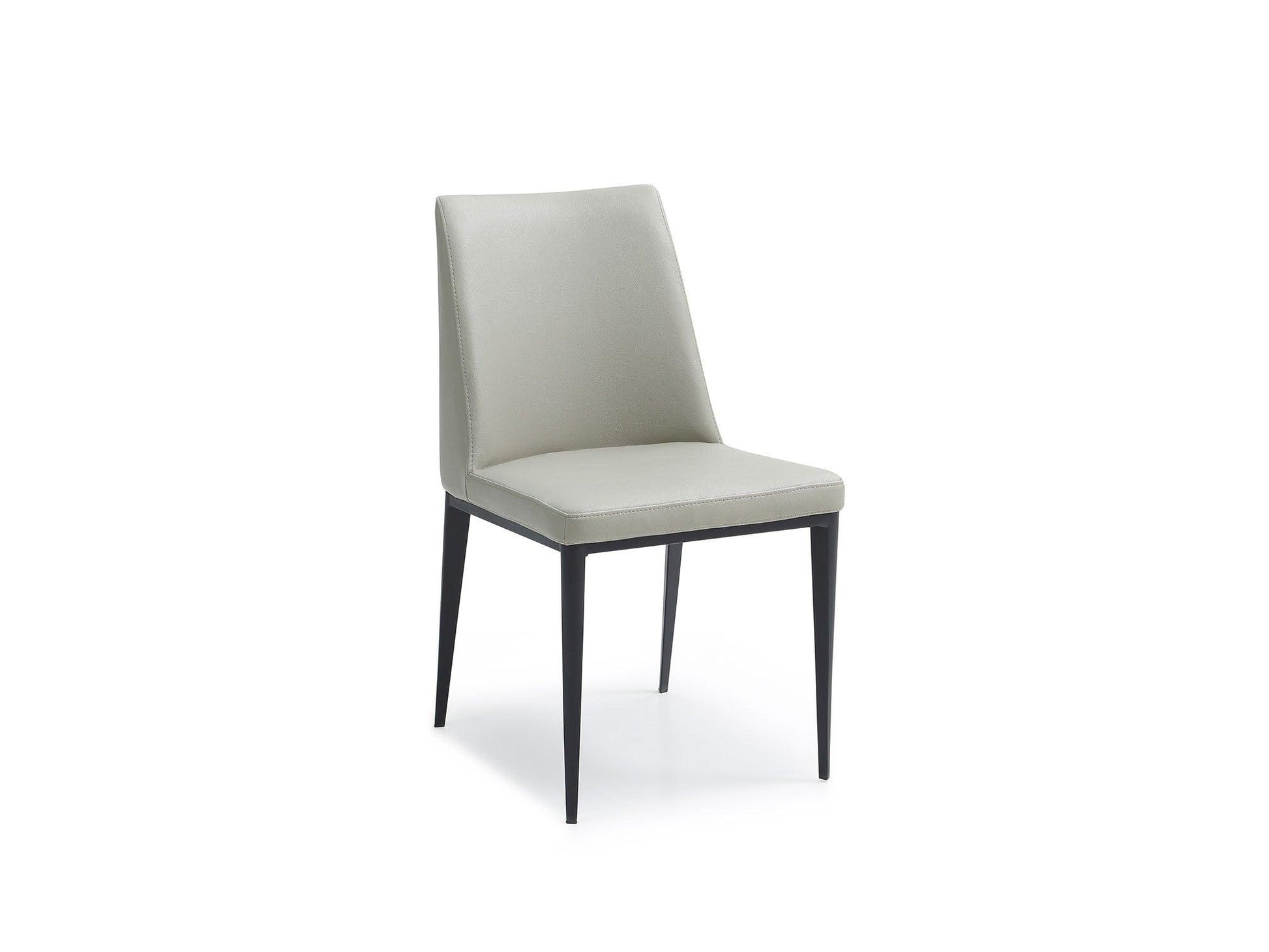 La sedia da pranzo Carter è disponibile in similpelle grigio chiaro o nera e ha una base in acciaio con rivestimento nero sabbiato.