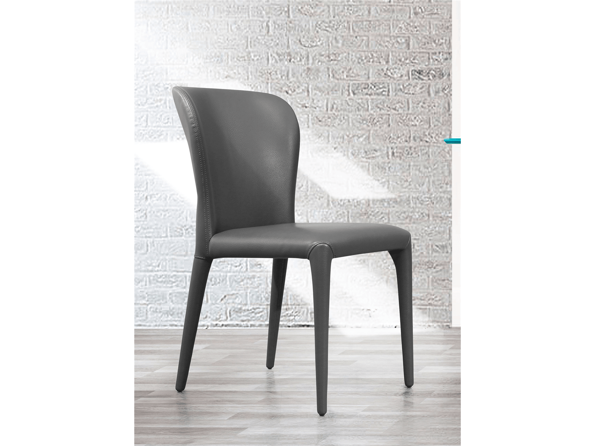 La sedia da pranzo Harrison è disponibile in similpelle grigia o bianca, che ricopre la seduta, lo schienale e le gambe.