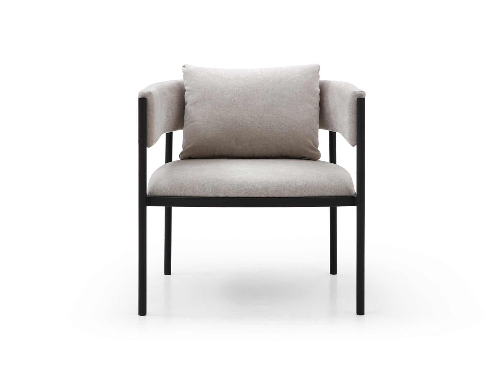 La poltrona Sonnie è realizzata in tessuto grigio chiaro e telaio in acciaio verniciato nero sabbiato.