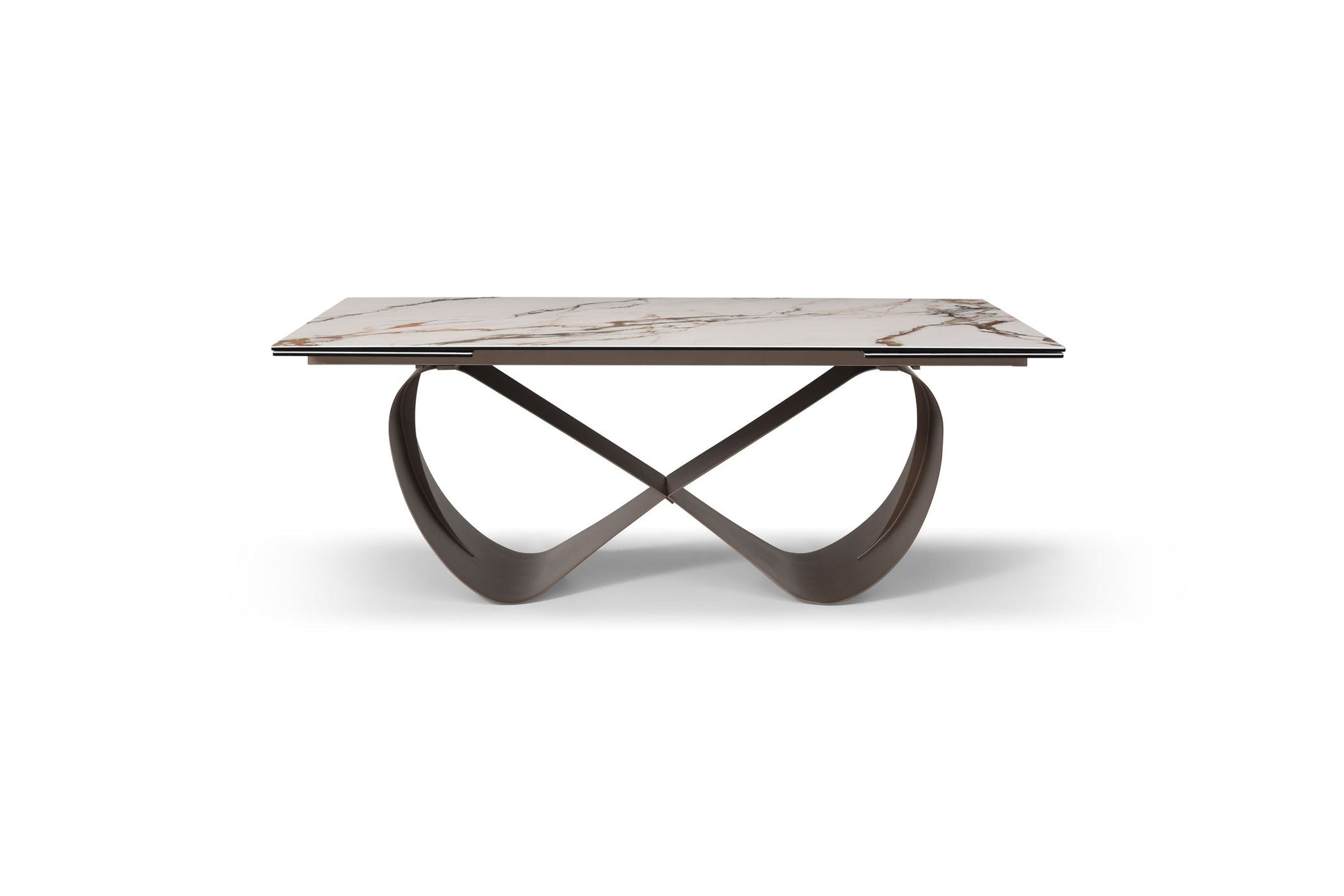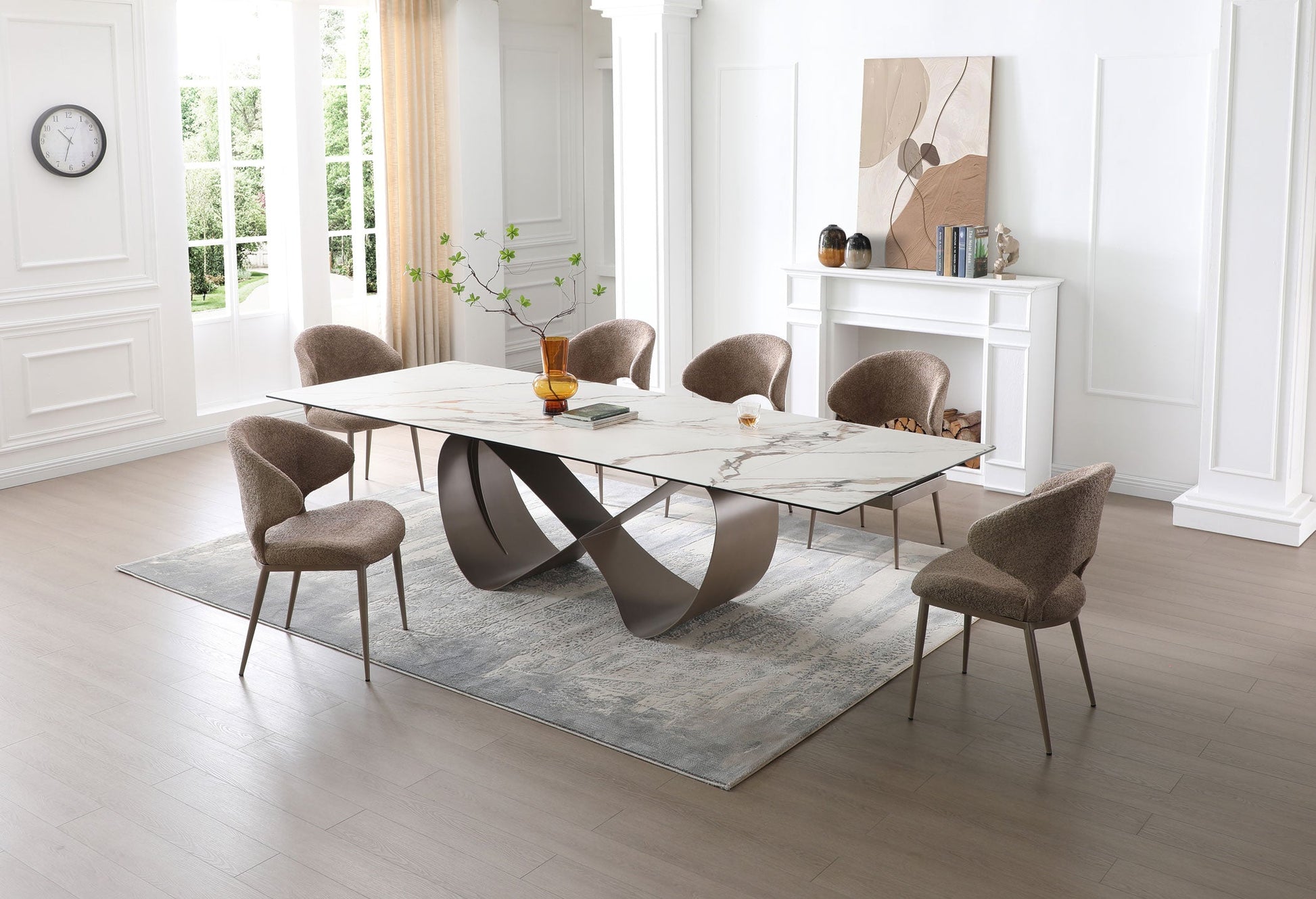 Splendido tavolo da pranzo impreziosito da una superficie in ceramica che emula alla perfezione l'elegante bellezza del marmo, donando un tocco di raffinata raffinatezza alla vostra sala da pranzo.