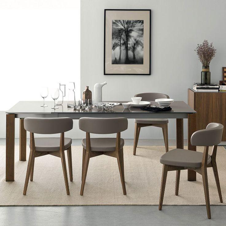 Tavolo allungabile Eminence con base in metallo e piano in materiali misti. Prolunga singola in laminato dello stesso colore del bordo del piano principale, dove il legno si affianca a ceramica, vetro temperato o impiallacciatura in legno. Questa ampia gamma di tavoli modulari si adatta a qualsiasi spazio e design.