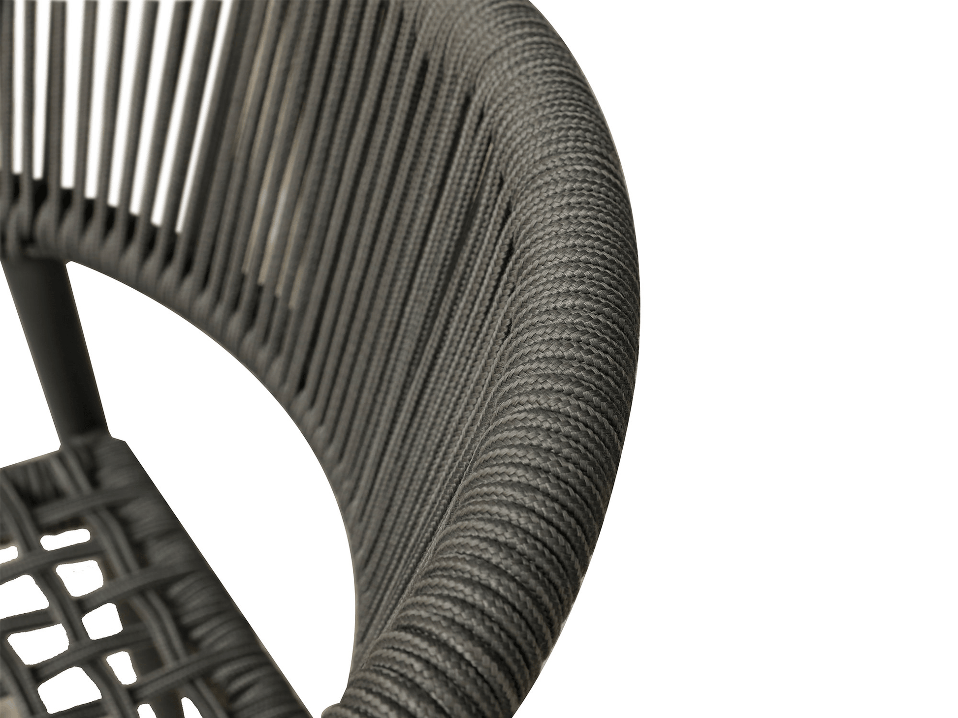 La poltrona da pranzo Adamina è realizzata con struttura in alluminio grigio e seduta e schienale in corda Olifen da 6 mm, sempre grigia. Le sedie sono impilabili. Vendute in set da 4.