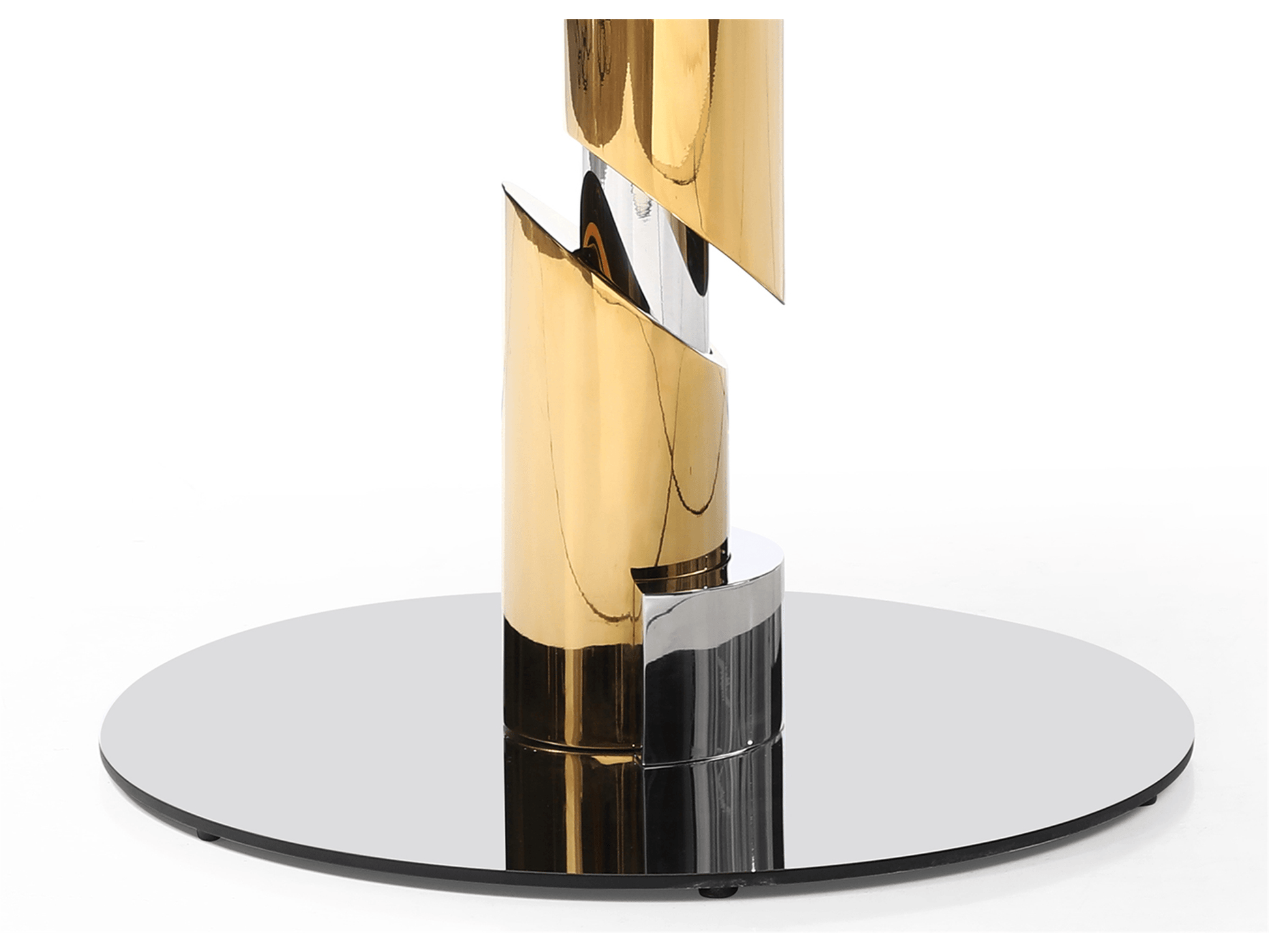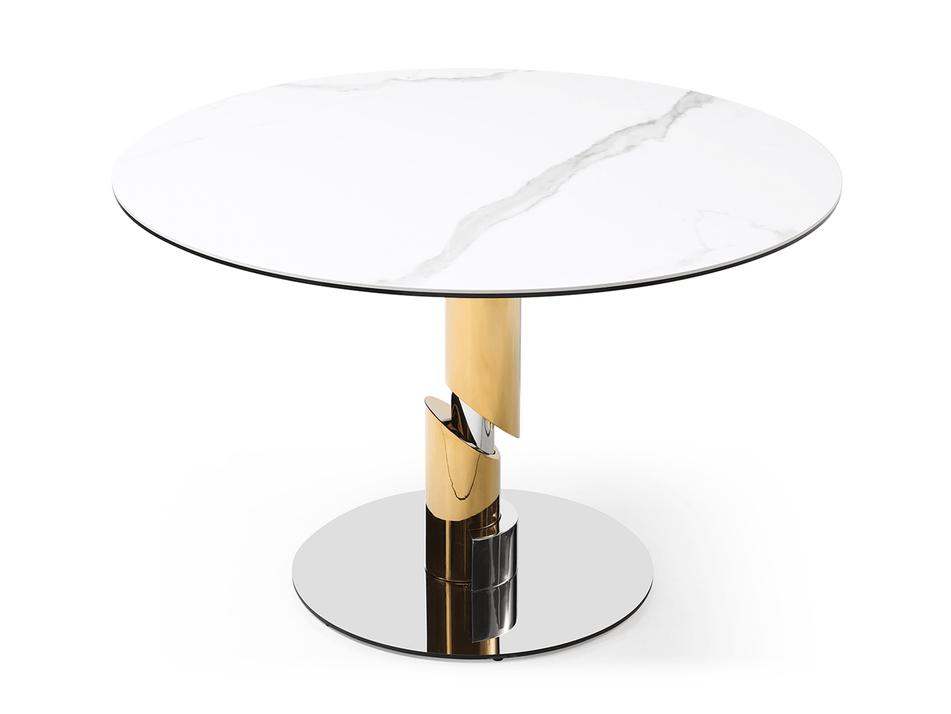 Tavolo da pranzo rotondo Brenna, piano in ceramica, base in acciaio inossidabile color oro e argento.