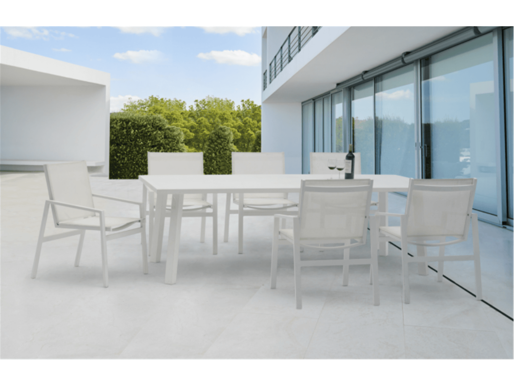 Moderna e tranquilla descrivono perfettamente la nostra collezione Brynne Outdoor. Progettata in alluminio bianco opaco e textline, la poltrona da pranzo Brynne Outdoor è ideale per qualsiasi patio contemporaneo. Il design permette di impilare le sedie.