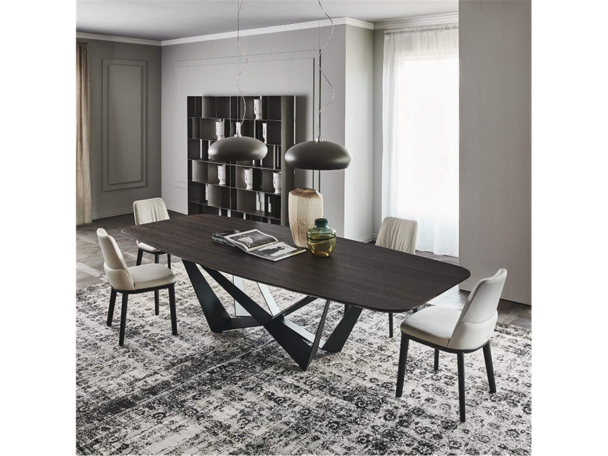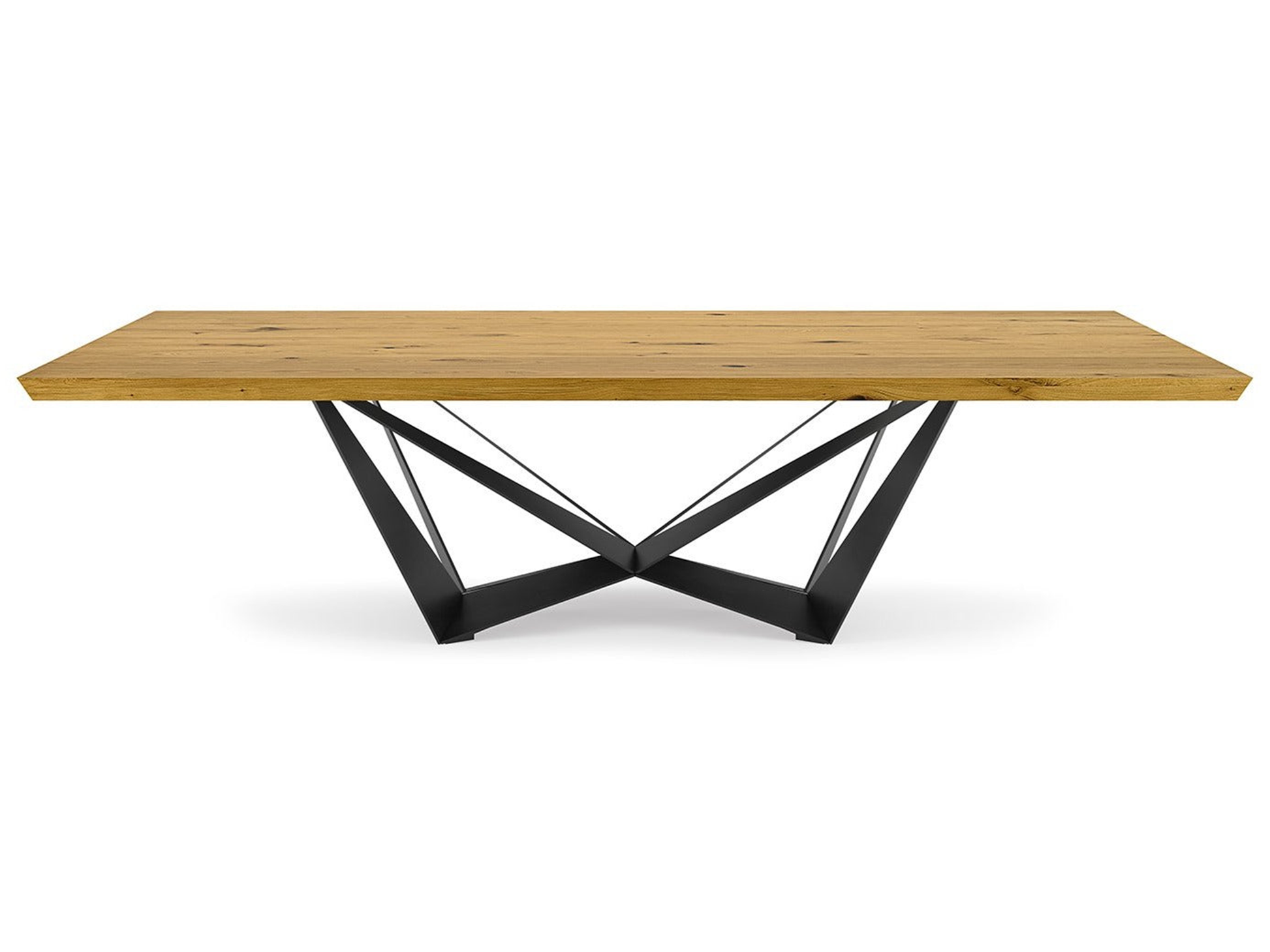 Tavolo con base in acciaio verniciato goffrato titanio (GFM11), bronzo (GFM18), graphite (GFM69), bianco (GFM71) o nero (GFM73), Brushed Bronze o Brushed Grey. Versione 'A': piano con bordi smussati in noce Canaletto (NC), rovere Heritage (HR), rovere bruciato (RB) o rovere naturale (RN). Piano in legno di spessore 4 cm per le versioni 160x160 e 200x100 e 5 cm per le versioni 240x120 e 300x120. Versione 'S': piano con bordi irregolari in massello di noce Canaletto (NC), rovere bruciato (RB) o rovere naturale (RN), spessore 4 cm. Versione 'B': piano a botte con bordi smussati in noce Canaletto (NC) o rovere bruciato (RB). Versione 'C': piano in noce Canaletto (NC) con profilo inferiore arrotondato laccato Brushed Grey oppure in Olmo poro aperto nero opaco (OLM73) con profilo inferiore arrotondato laccato Brushed Bronze. Versione 'Masterwood': sagomato a barca in noce Canaletto (NC) o Rovere Bruciato (RB) realizzato con listoni di legno di diverse dimensioni disposti in diagonale. Bordo obliquo e arrotondato .