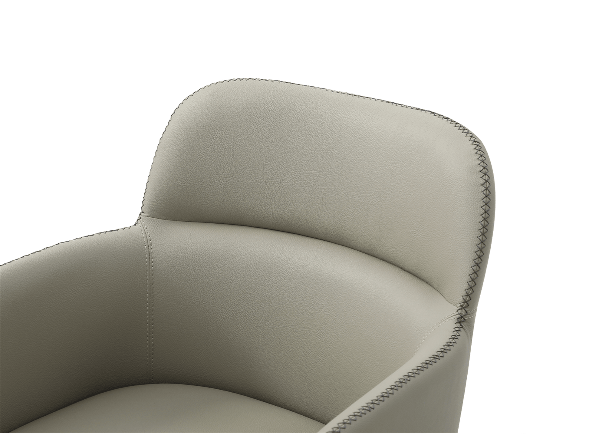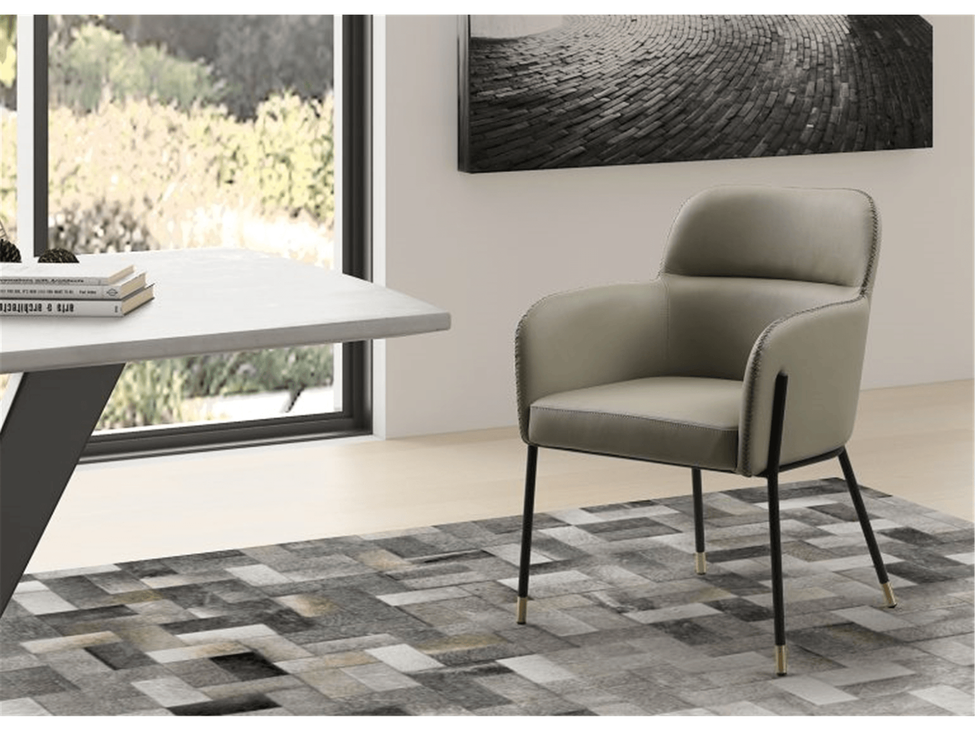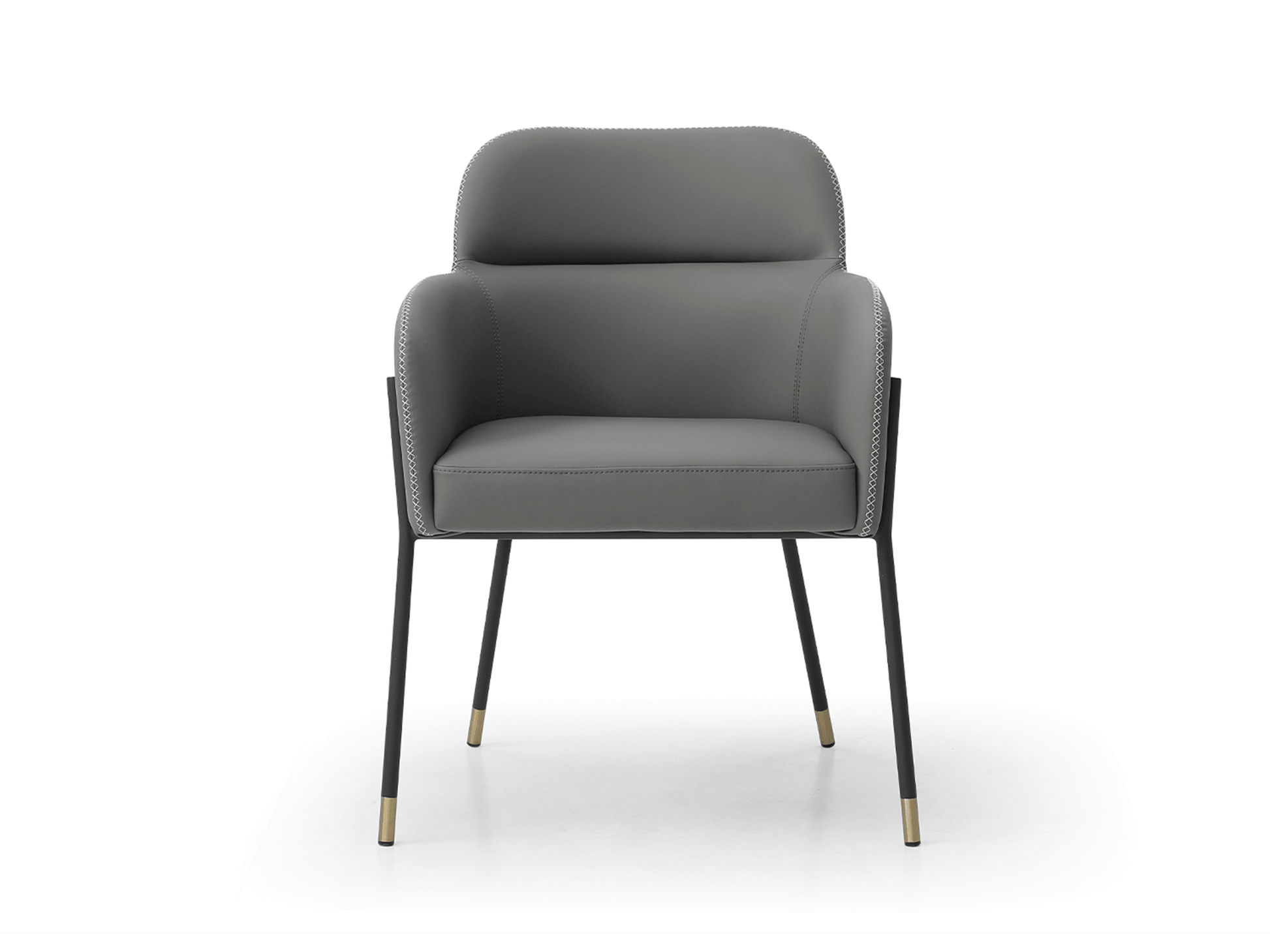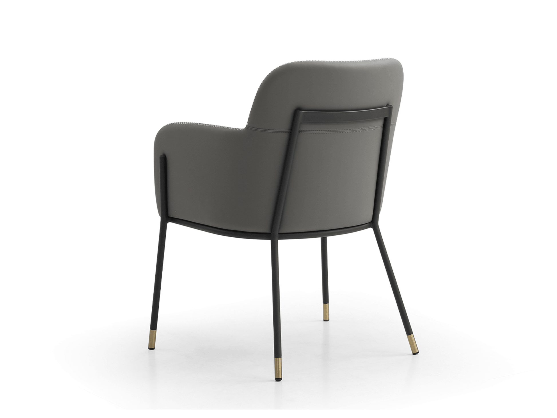 La poltrona da pranzo Richard è disponibile in similpelle color cuoio, grigio scuro o grigio chiaro con cuciture grigio scuro, gambe in acciaio verniciato nero sabbiato e terminali delle gambe in ottone spazzolato.