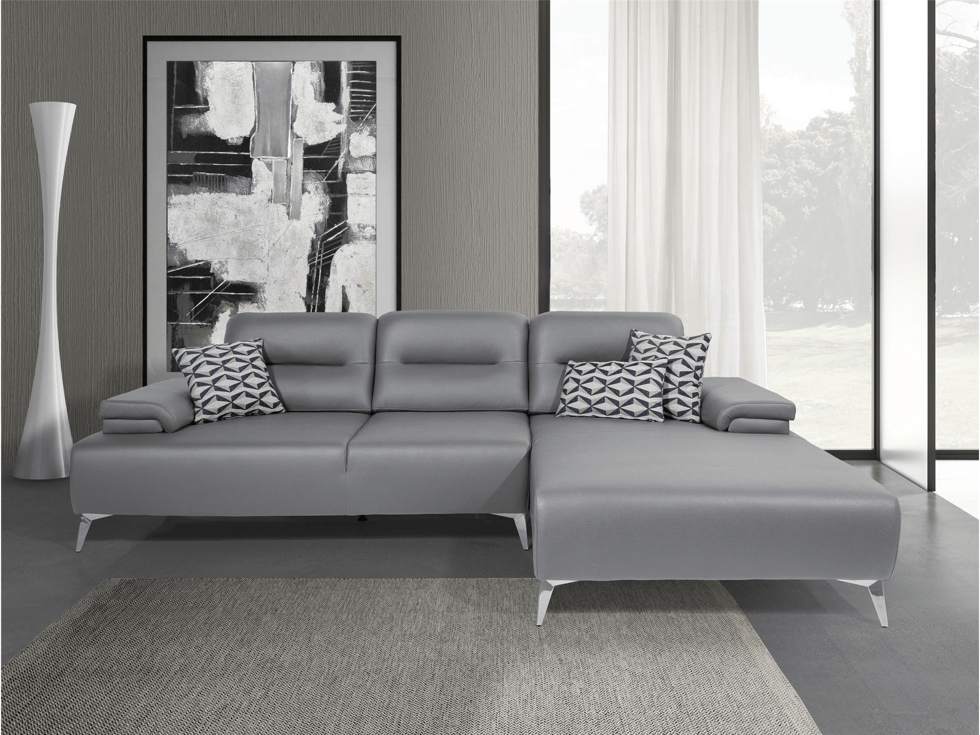 Ruslan Sectional è un divano componibile contemporaneo dalle linee pulite e materiali di alta qualità. È disponibile in pelle nabuk grigio chiaro con chaise longue rivolta verso l'interno, schienale e braccioli estraibili con tre cuscini in lino intrecciato inclusi e gambe in nichel cromato e lucidate.