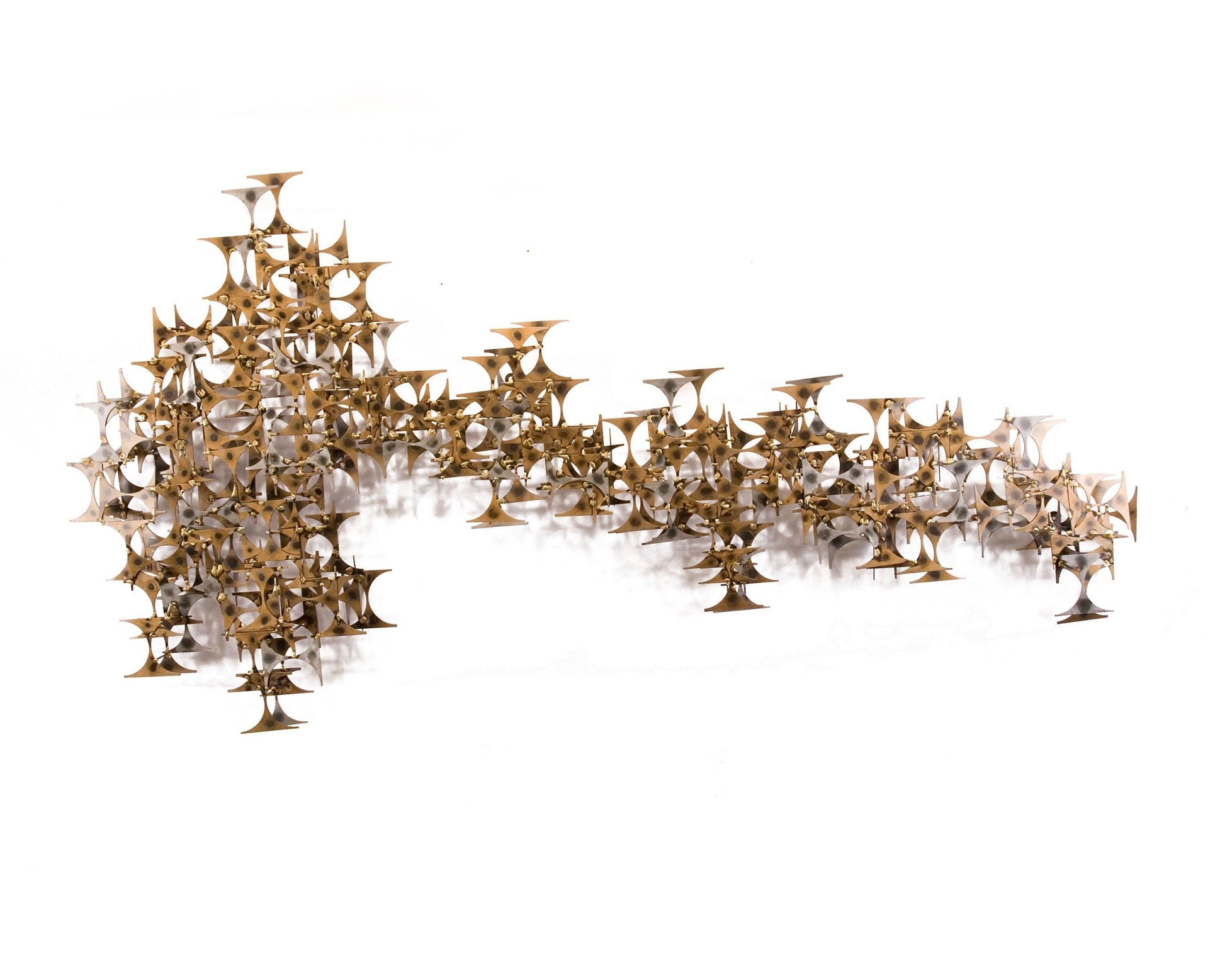 Elementi in acciaio trattato alla fiamma, vernice dorata e accenti trattati alla fiamma