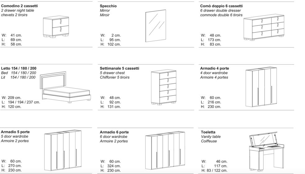 La collezione Letto è un set senza tempo. Realizzata al 100% in Italia con la migliore artigianalità. Questa collezione è caratterizzata da impiallacciatura in legno con finitura lucida. Questa camera da letto include: