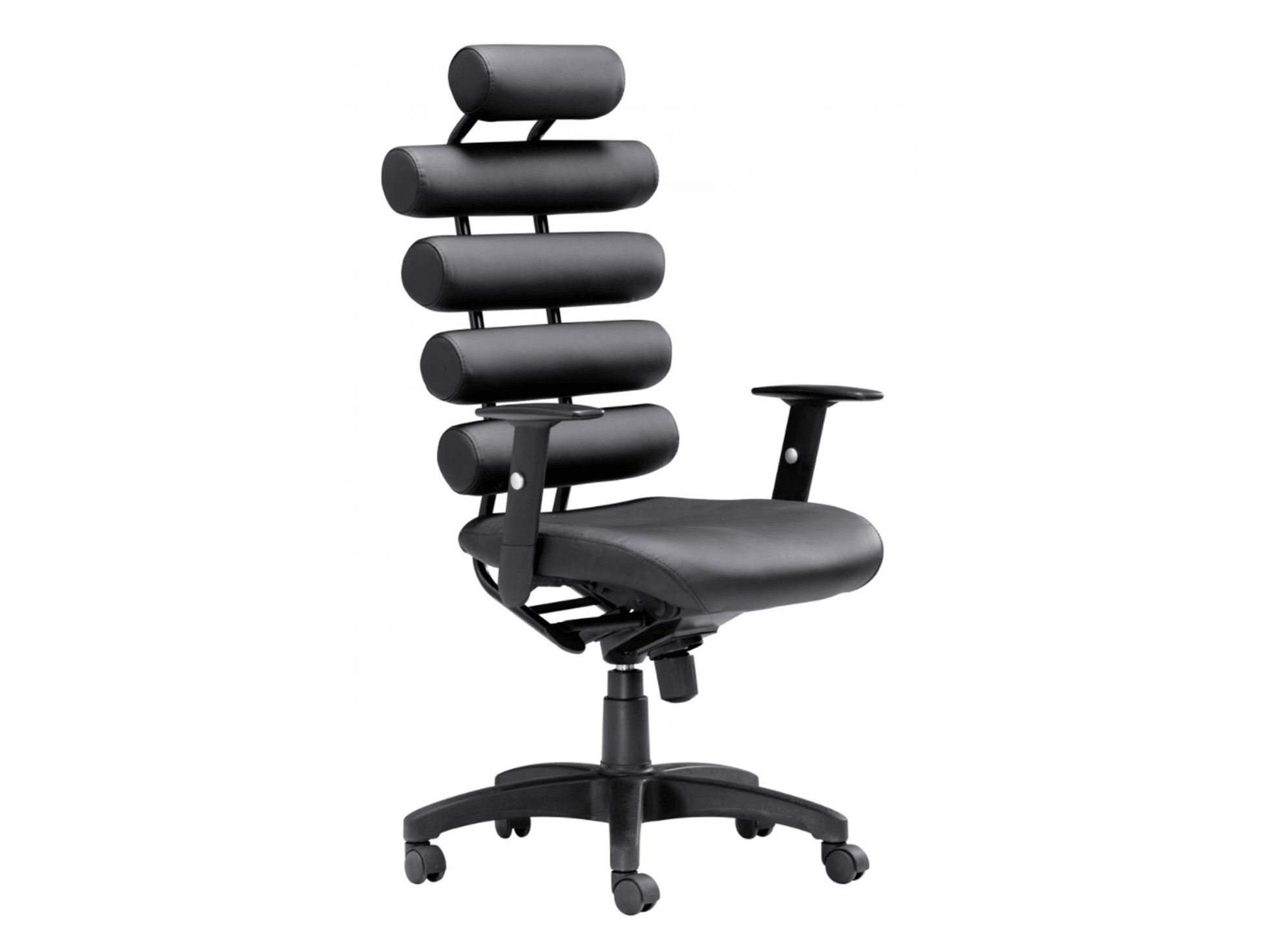 Questa sedia da ufficio con schienale alto offre il massimo supporto lombare. Unico è dotata di robusti cuscini imbottiti in poliuretano al 100% per lo schienale e di una seduta morbida. Il telaio è in tubo d'acciaio e i braccioli sono regolabili in altezza. Il meccanismo di inclinazione è bloccabile e regolabile in altezza.