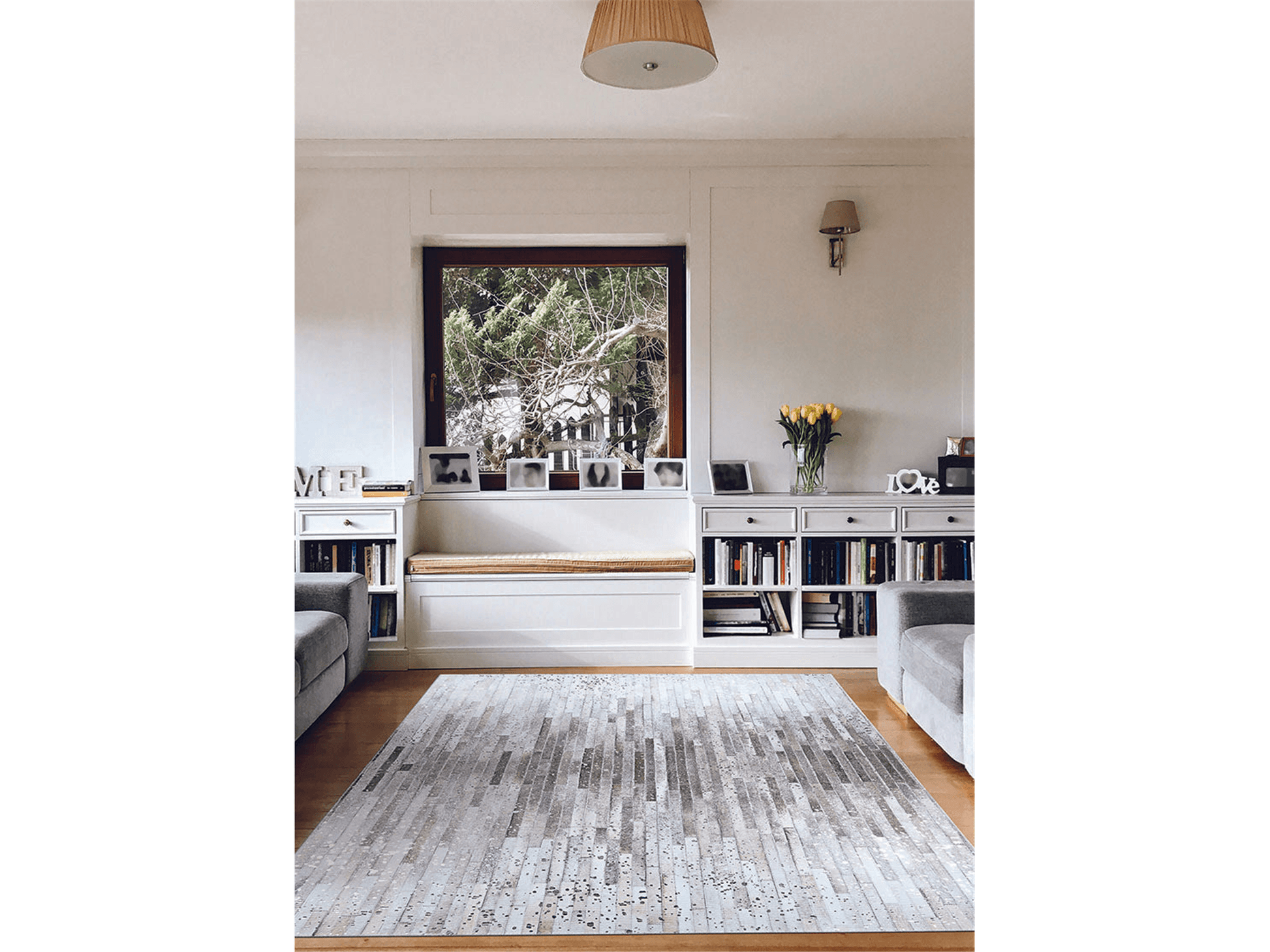 Unendo l'aspetto rilassato e casual dei tradizionali tappeti in pelle di mucca, la collezione Perry porta la tendenza della pelle a un livello superiore. Questi tappeti stampati digitalmente sono stati progettati per emulare la pelle di mucca in vari motivi geometrici. Dotati di una base tessuta a macchina in 100% poliestere e di un retro antiscivolo, queste repliche in pelo doneranno a qualsiasi ambiente una sensazione ariosa e accogliente. Perfetti per ambienti monocromatici che necessitano di una solida base neutra, l'aspetto di questi eleganti tappeti è così realistico che i loro disegni stampati digitalmente forniranno un ulteriore senso di dimensione e sensazione al tatto senza l'uso di alcuna texture. Realizzati con un'estetica casual-chic e fresca, questi modelli stampati digitalmente sono innovativi e intriganti.
