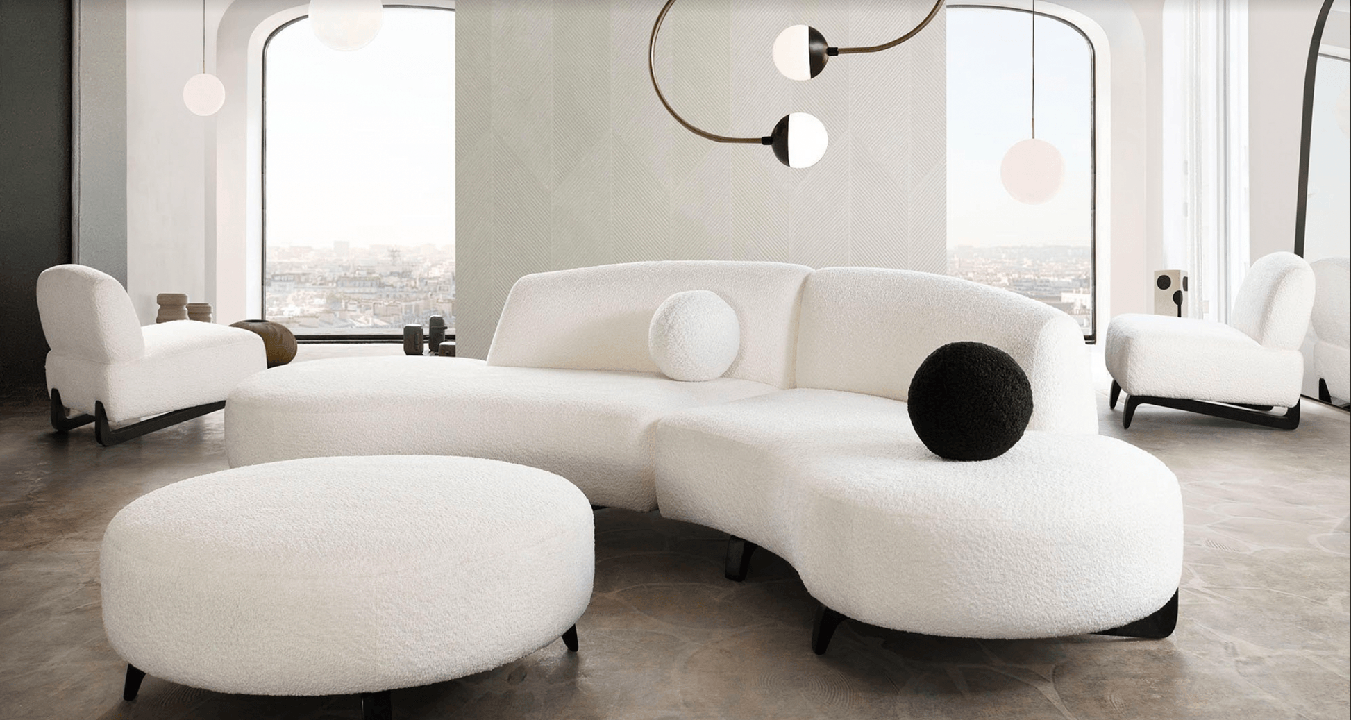Chaise longue destra + chaise longue sinistra in tessuto Boucle. Struttura in legno nero.