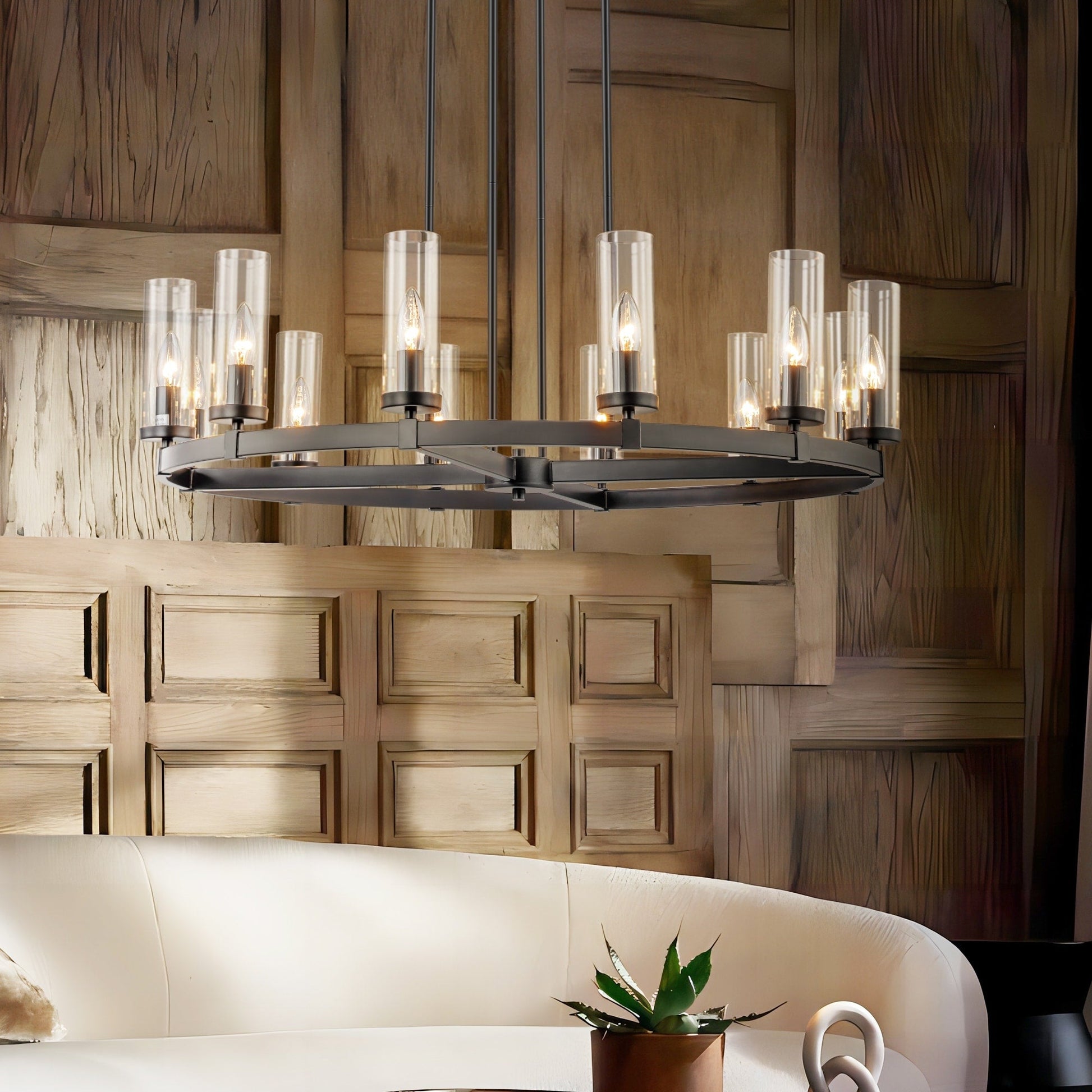 Lampadario a ruota di carro in vetro trasparente con cilindro in stile Mid-Century Modern, 12 luci, grande lampadario in oro/nero