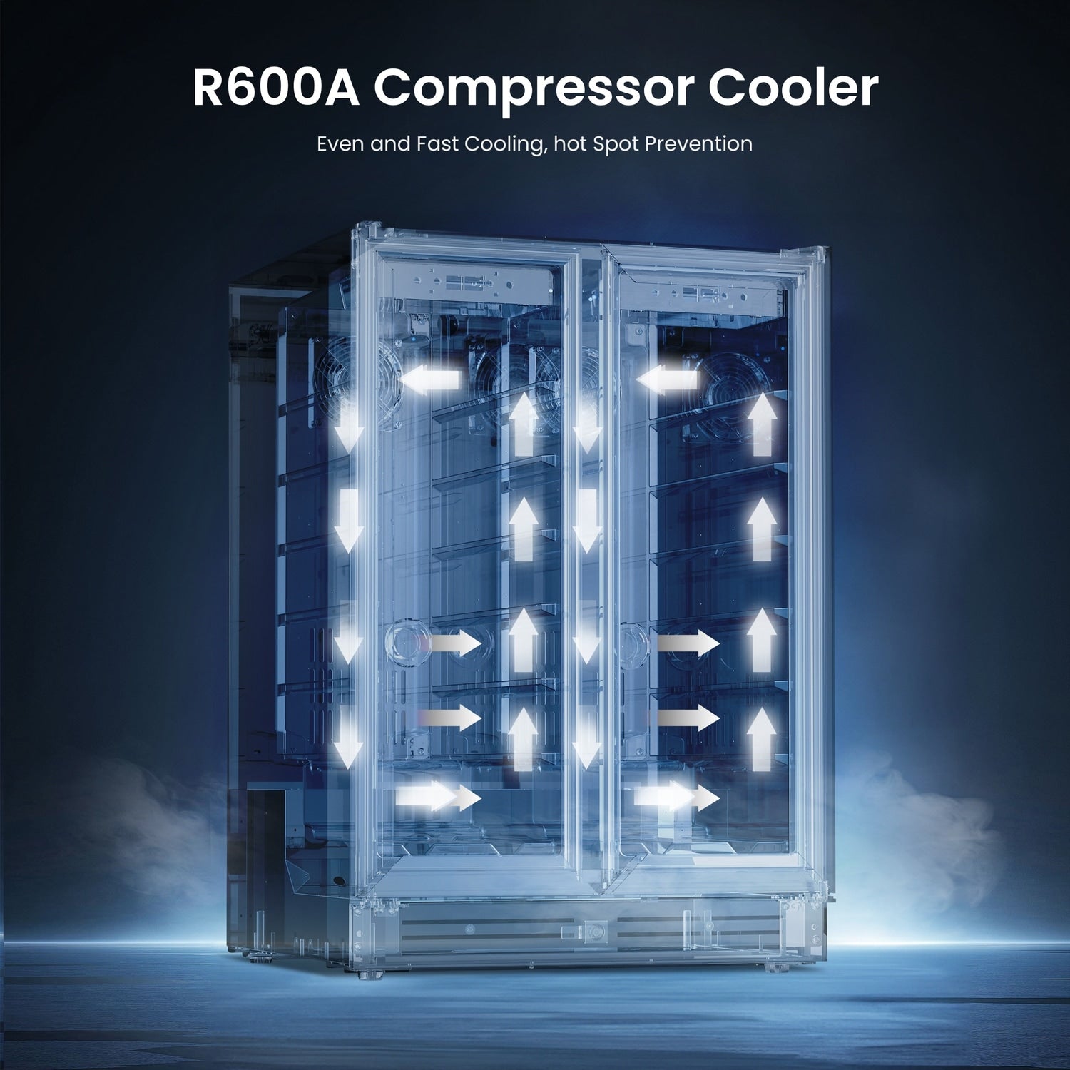 • Raffreddamento ecologico ed efficiente: dotato di refrigerante R600a e certificazione DOE, il refrigeratore per vino e bevande Yeego offre un raffreddamento rapido e uniforme, risparmiando energia. Il sistema di ventilazione frontale migliora la circolazione dell'aria e la dissipazione del calore, mentre il filtro a carboni attivi rimuove gli odori, mantenendo un ambiente fresco all'interno di questo frigorifero per vino e bevande.