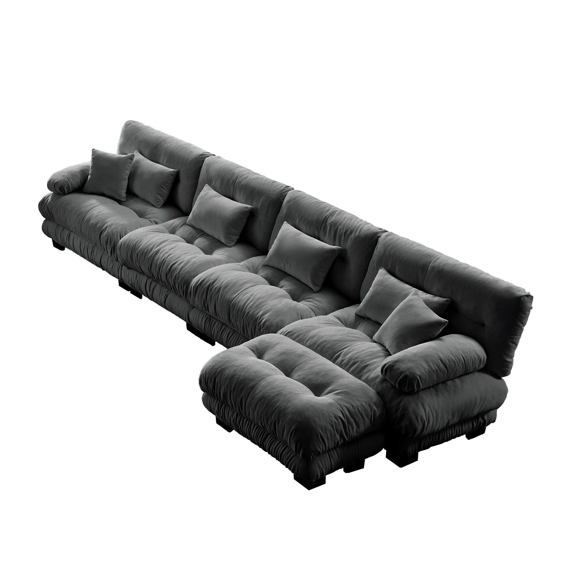 - Realizzato in morbido tessuto in stile vintage e con imbottitura soffice, questo divano modulare a 3 posti offre sedute profonde, flessibilità di disposizione e un comfort elegante. Con cuscini inclusi e un pouf coordinato, è un'opzione versatile per rilassarsi, leggere o semplicemente rilassarsi in qualsiasi stanza.