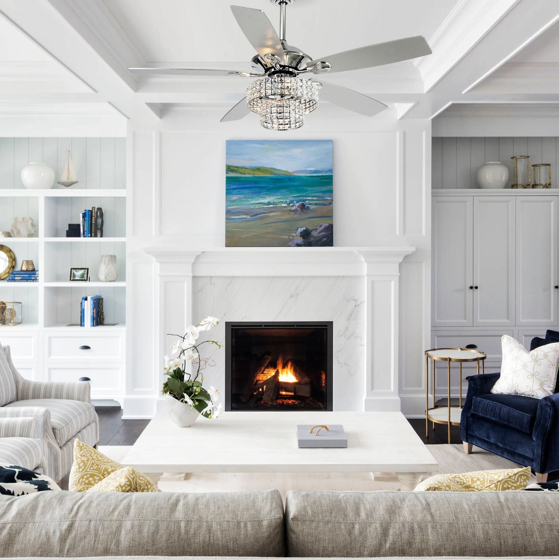 Ventilatore da soffitto moderno in cristallo cromato da 52 pollici con 5 pale in legno e telecomando