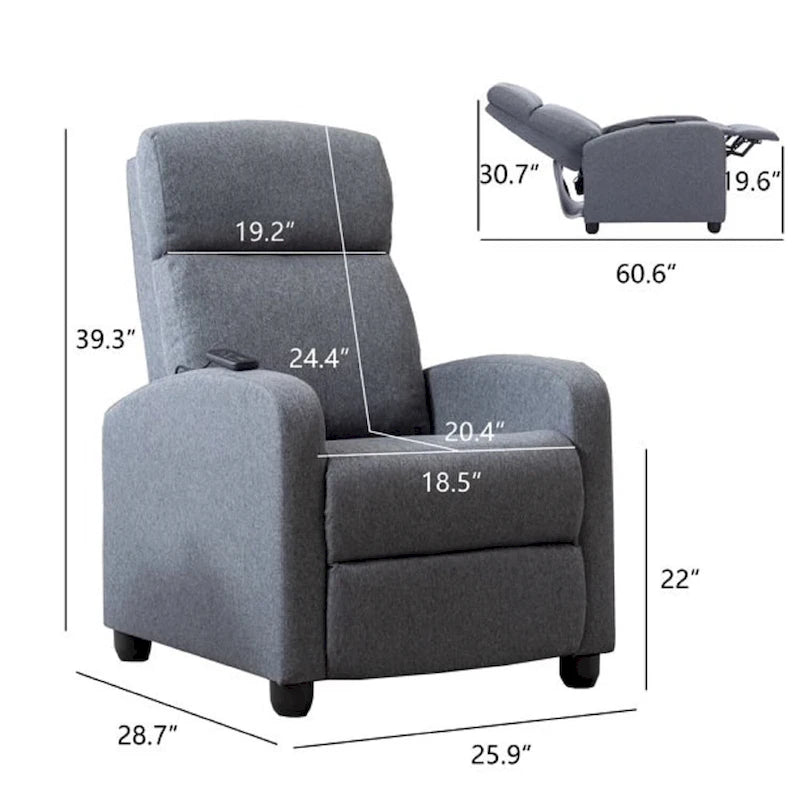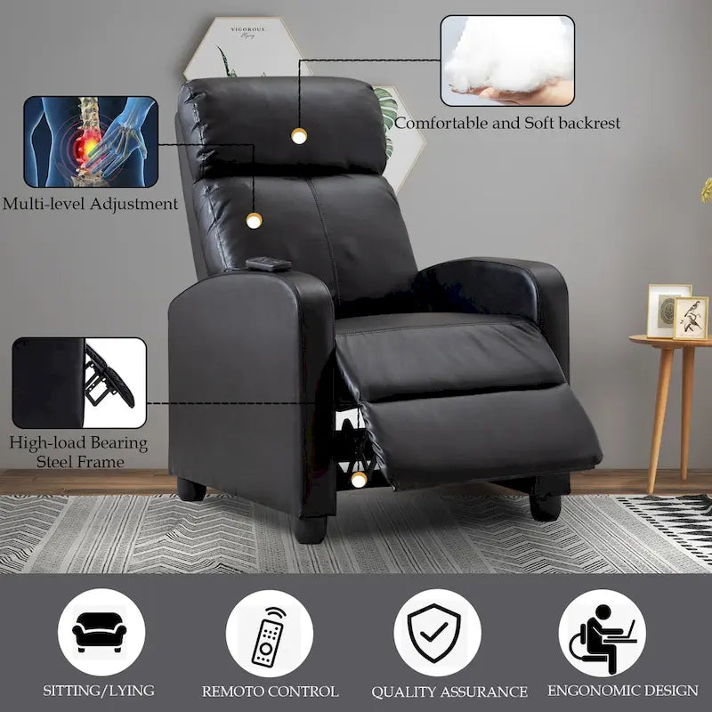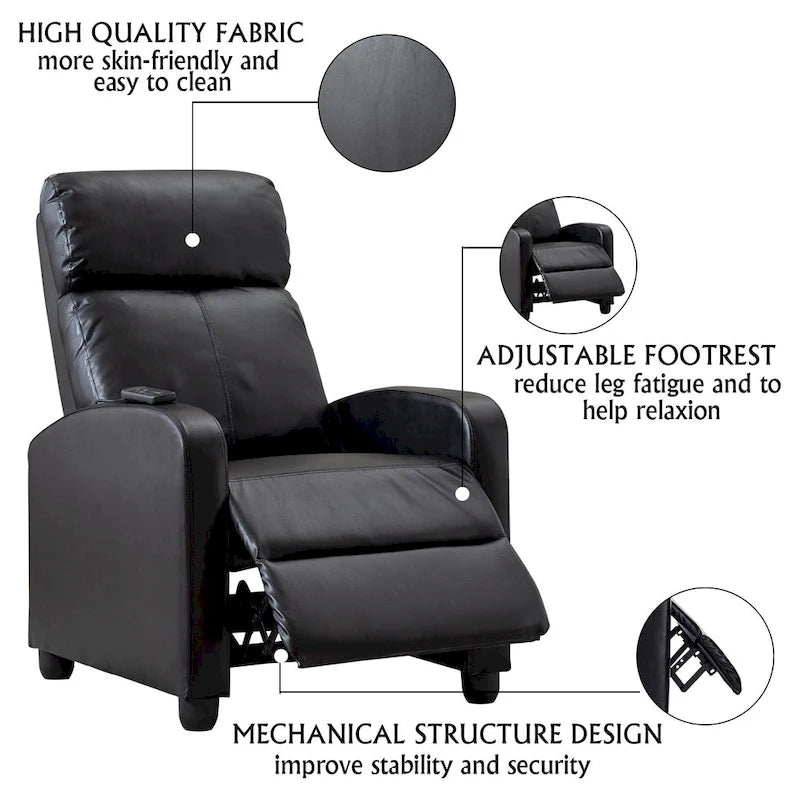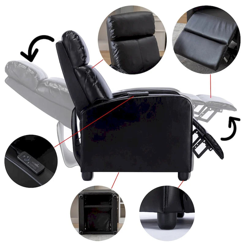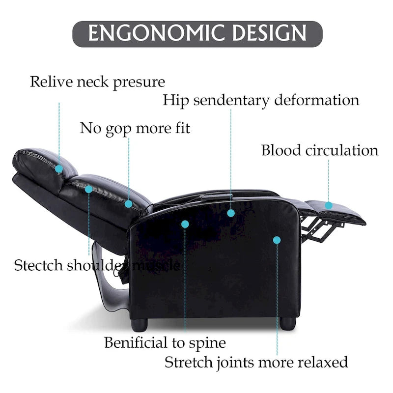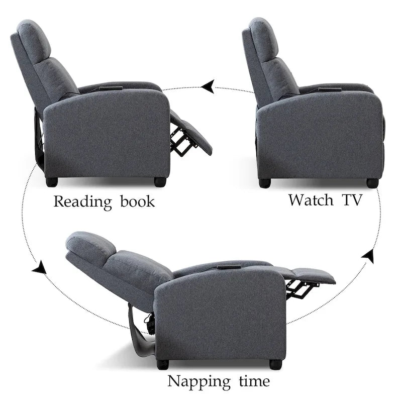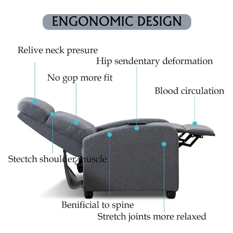 Questa è una piccola ma pratica poltrona reclinabile per soggiorno e camera da letto, perfetta per spazi limitati. Spingere il bracciolo della poltrona reclinabile per estendere il poggiapiedi dalla parte anteriore per allungare le gambe e tirarlo indietro sul poggiapiedi con i talloni fino a quando non si blocca in posizione quando non in uso. Il design umanizzato con schienale confortevole per diversi utilizzi, dalla lettura di libri, alla visione della TV e al sonno, offre un comfort estremo per collo, schiena e zona lombare. Meccanismo di reclinazione fluido per un'esperienza di relax eccezionale.