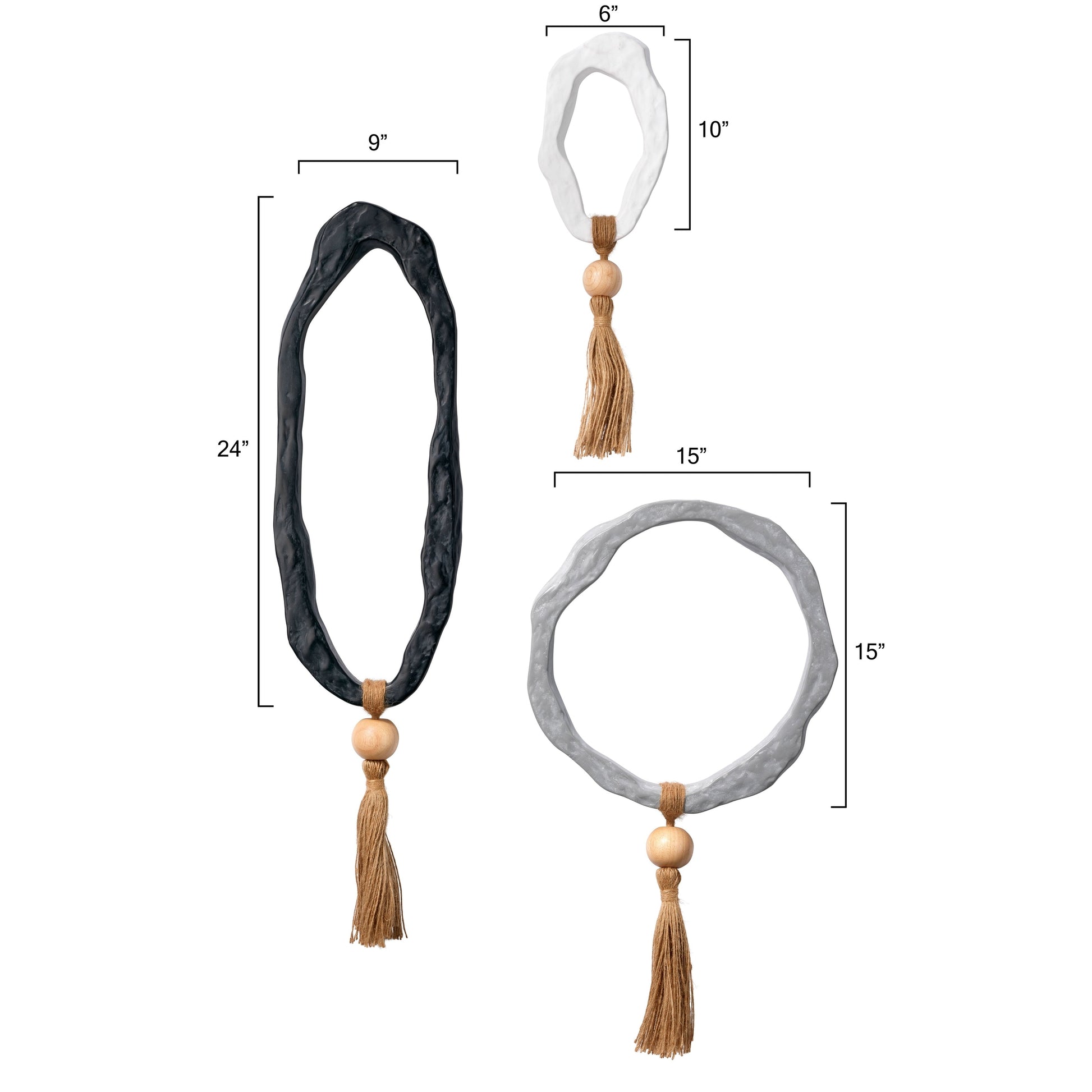 Ispirato ai motivi orientali, questo set di tre arazzi decorativi crea un punto focale sorprendente sulla tua parete. Realizzati a mano in resina, questi anelli organici dalla forma libera presentano perline di legno e corda di sisal. Appesi in fila decorativa o singolarmente come ornamenti sparsi in qualsiasi stanza che ne abbia bisogno.