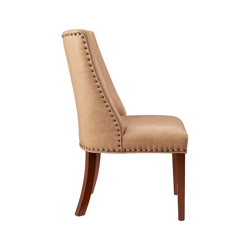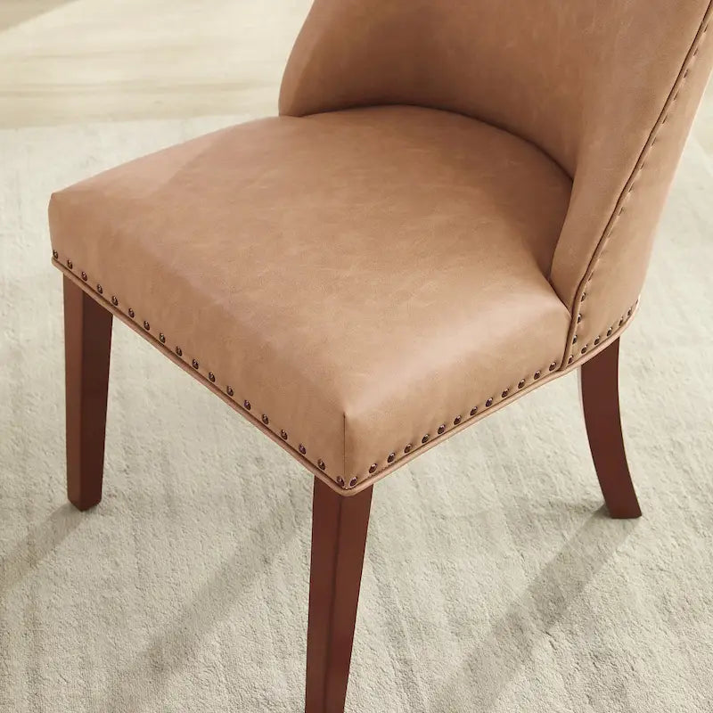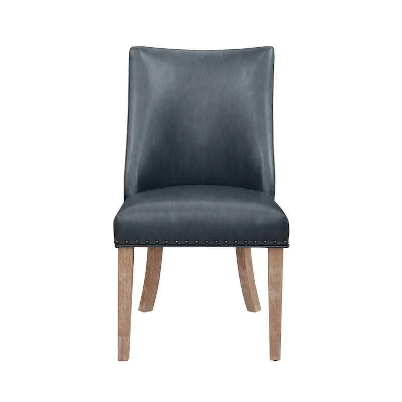 Godetevi uno stile senza tempo e un comfort moderno a tavola con questa coppia di sedie eleganti. L'ecopelle screziata in un blu navy intenso come l'Atlantico o in un marrone chiaro è tesa su cuscini di supporto in schiuma ed è impreziosita da un bordo con borchie in bronzo anticato. Un anello decorativo in bronzo abbinato si trova sul retro degli schienali a botte. Le gambe affusolate in legno di eucalipto presentano una tinta naturale o marrone e una finitura anticata per un look vintage che si avvicina allo stile boho. Disponibile anche in un set da 5 pezzi con tavolo in vetro bisellato abbinato.