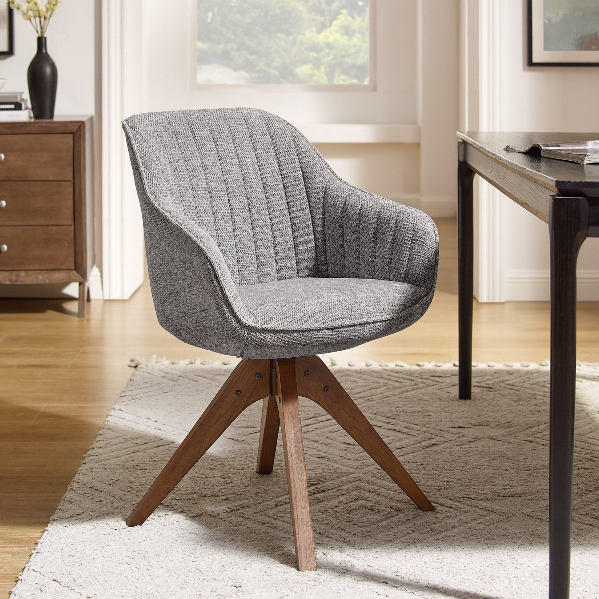 Rinnova il tuo ufficio in casa con questa elegante poltrona girevole. Il design moderno di metà secolo presenta una seduta sagomata con braccioli inclinati e trapuntatura a canale lungo lo schienale e i braccioli. La comoda seduta imbottita e lo schienale reclinabile sono rivestiti in tessuto o similpelle a scelta. Le gambe in legno massello di faggio sono rifinite con una laccatura color noce e si estendono verso l'esterno per un look retrò. La poltrona è anche girevole a 360 gradi per una maggiore funzionalità.