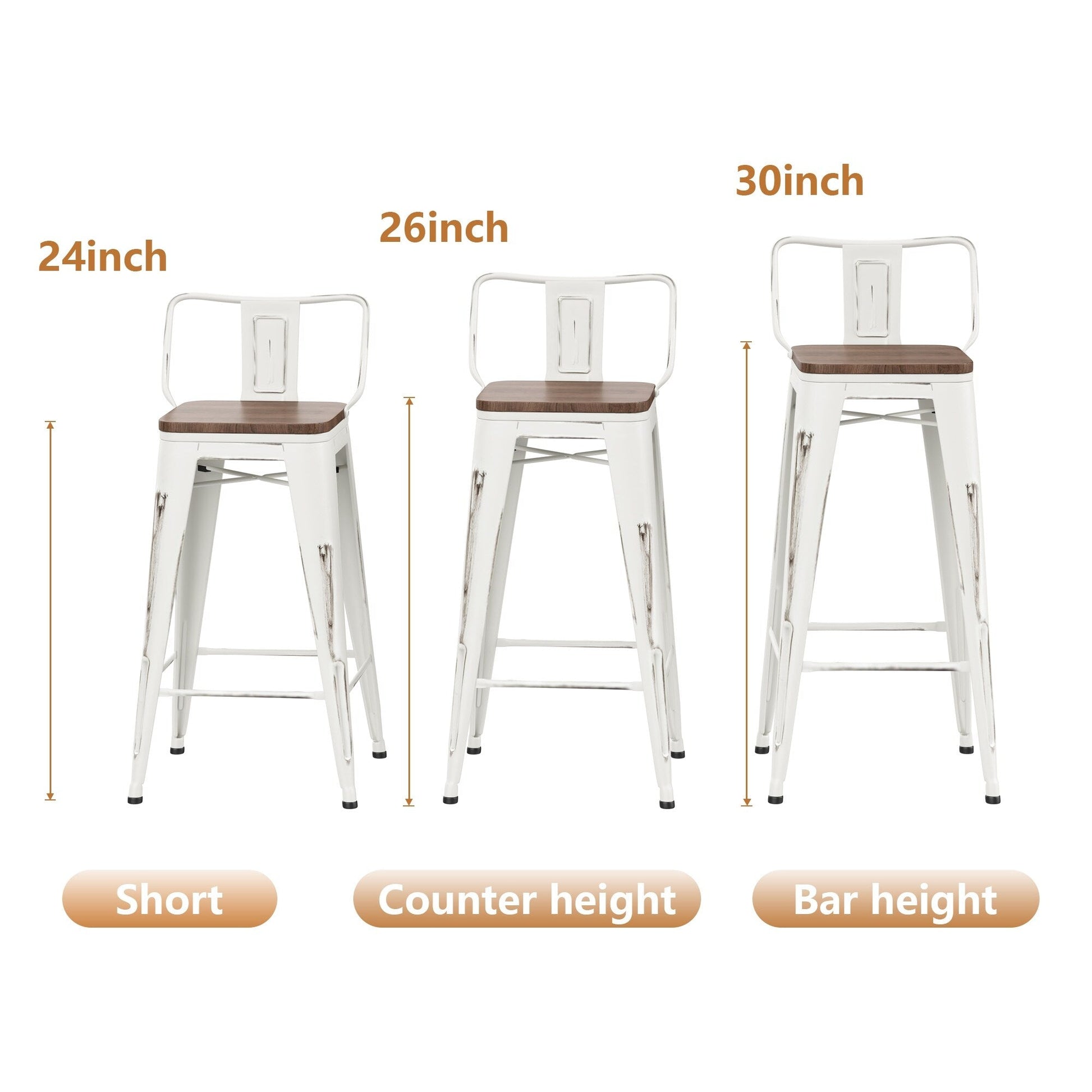 Rinnova la tua casa o il tuo ristorante con lo stile industriale di questi sgabelli da bar con schienale. Ogni set include quattro robusti sgabelli da bar in metallo con schienali rimovibili, facili da impilare e riporre. Disponibili nelle altezze basse, da bancone e da bar, queste sedie sono perfette per qualsiasi sala da pranzo o bar. Le sedute in legno e la resistente finitura verniciata elettronicamente li rendono eleganti e durevoli, mentre il supporto a croce e i piedini in gomma antigraffio garantiscono stabilità e protezione del pavimento.
