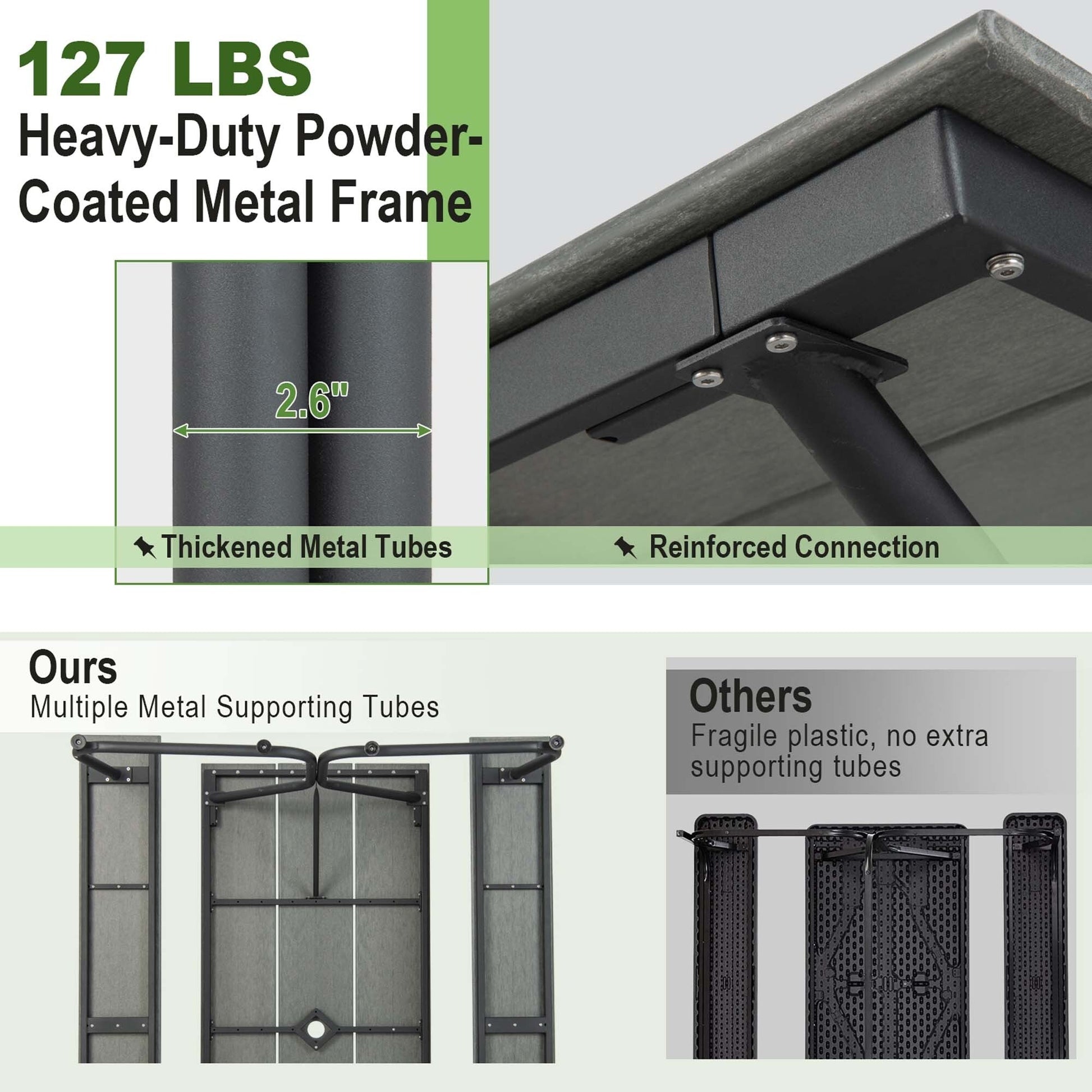 Questo set da picnic per esterni è progettato con un ampio tavolo da picnic e 2 panche, ciascuna delle quali può ospitare fino a 3-44 persone. A differenza di altri tavoli in legno, soggetti a corrosione, e di tavoli in metallo, soggetti a ruggine, il nostro piano in HDPE è resistente allo sporco, impermeabile e offre protezione solare, per una durata che dura negli anni. Inoltre, la robusta struttura in metallo è realizzata con tubi metallici ispessiti da 3,3 cm e adotta giunti rinforzati, garantendo un'ottima robustezza. 8 ampi piedini regolabili sul fondo contribuiscono a mantenerlo stabile anche su terreni irregolari. Inoltre, il tavolo da pranzo è dotato di un foro per ombrellone integrato (diametro: 5,8 cm), che offre praticità per l'inserimento di un ombrellone e per godersi un'area esterna ombreggiata. Con la sua squisita fattura e le linee eleganti, questo elegante tavolo da picnic può anche essere un elemento di spicco per qualsiasi spazio interno o esterno.