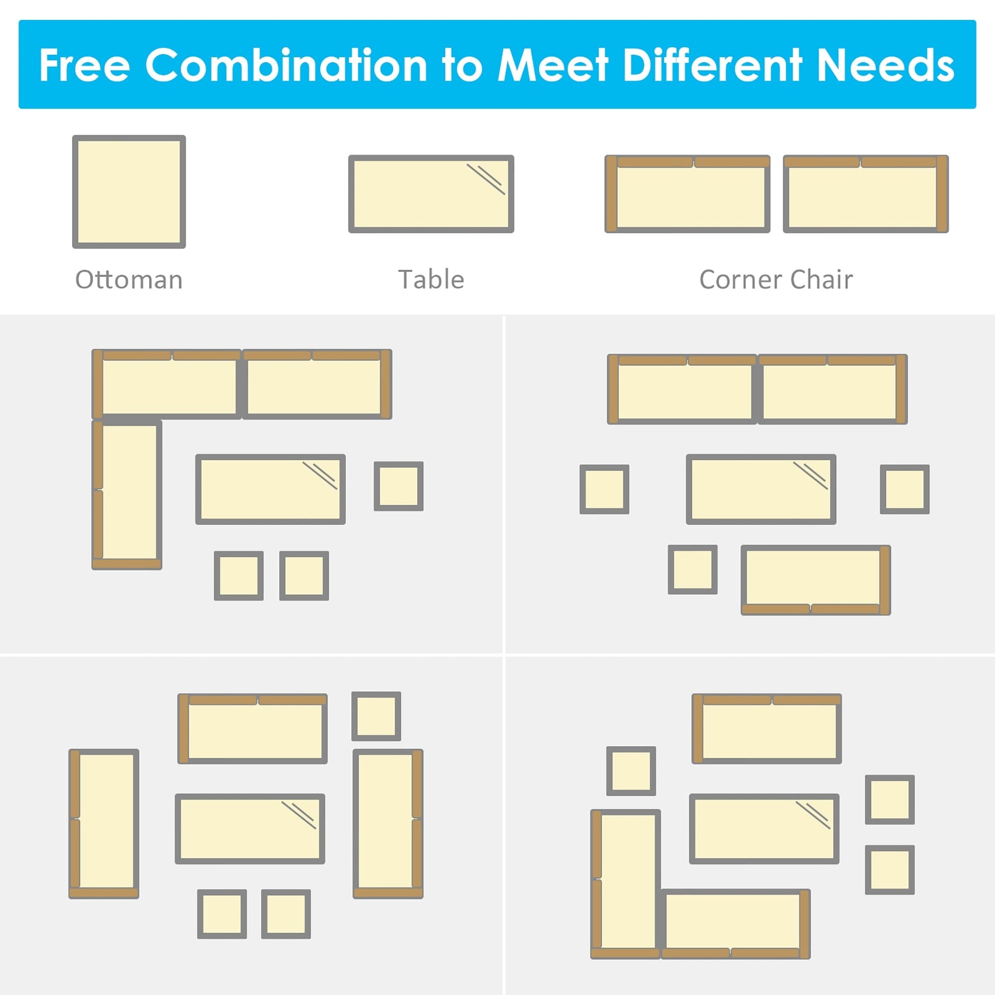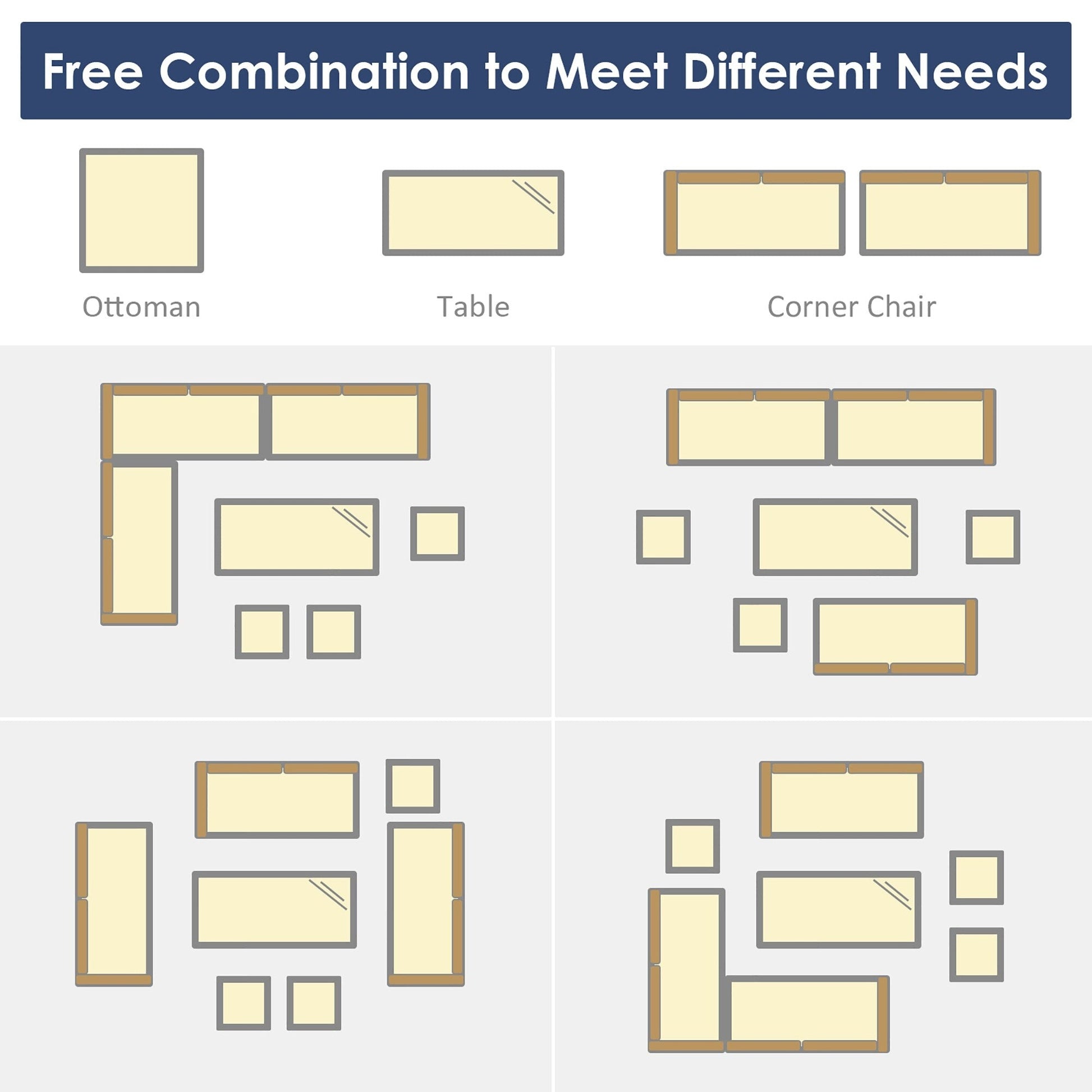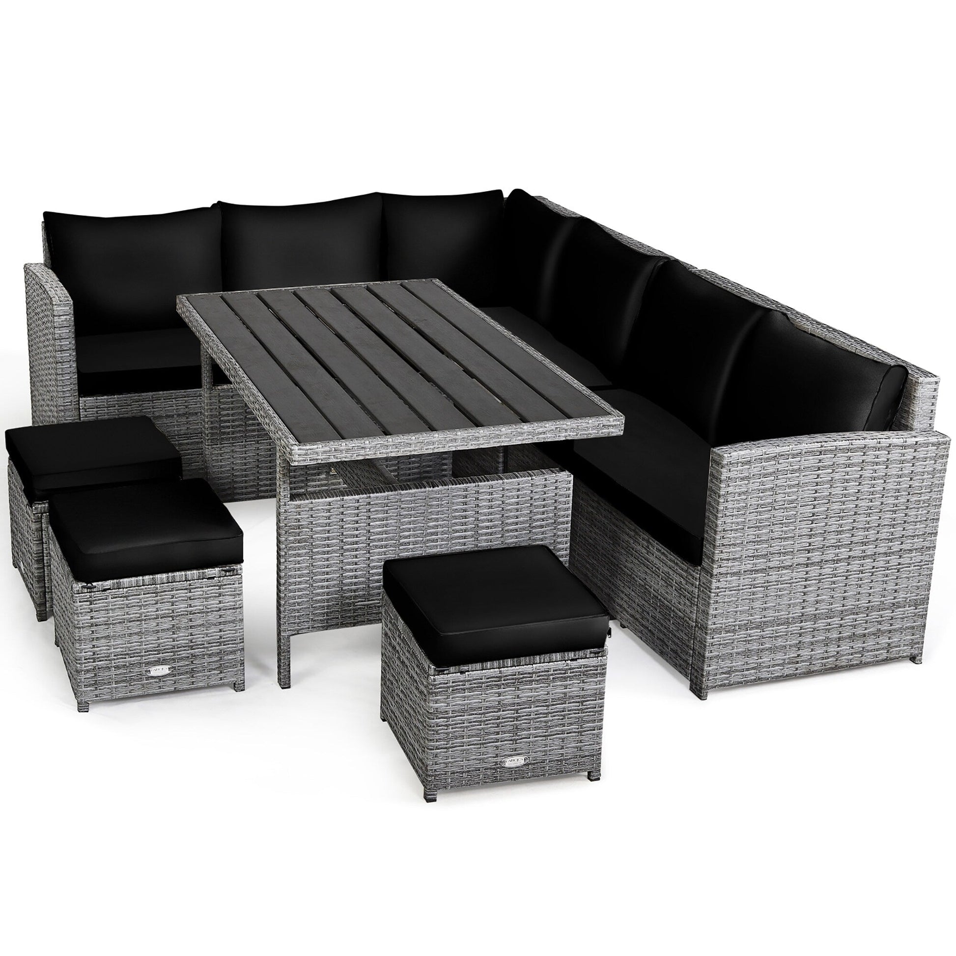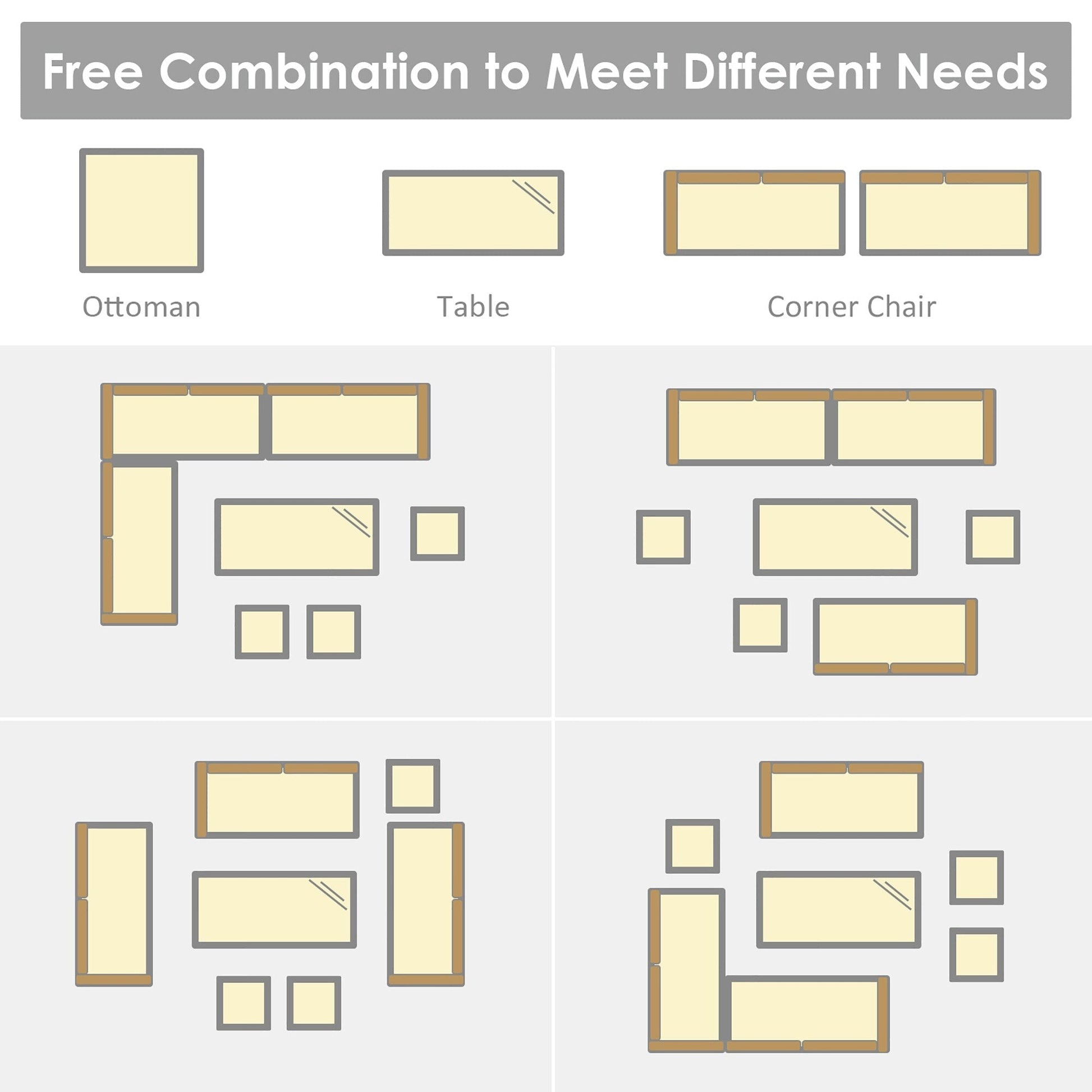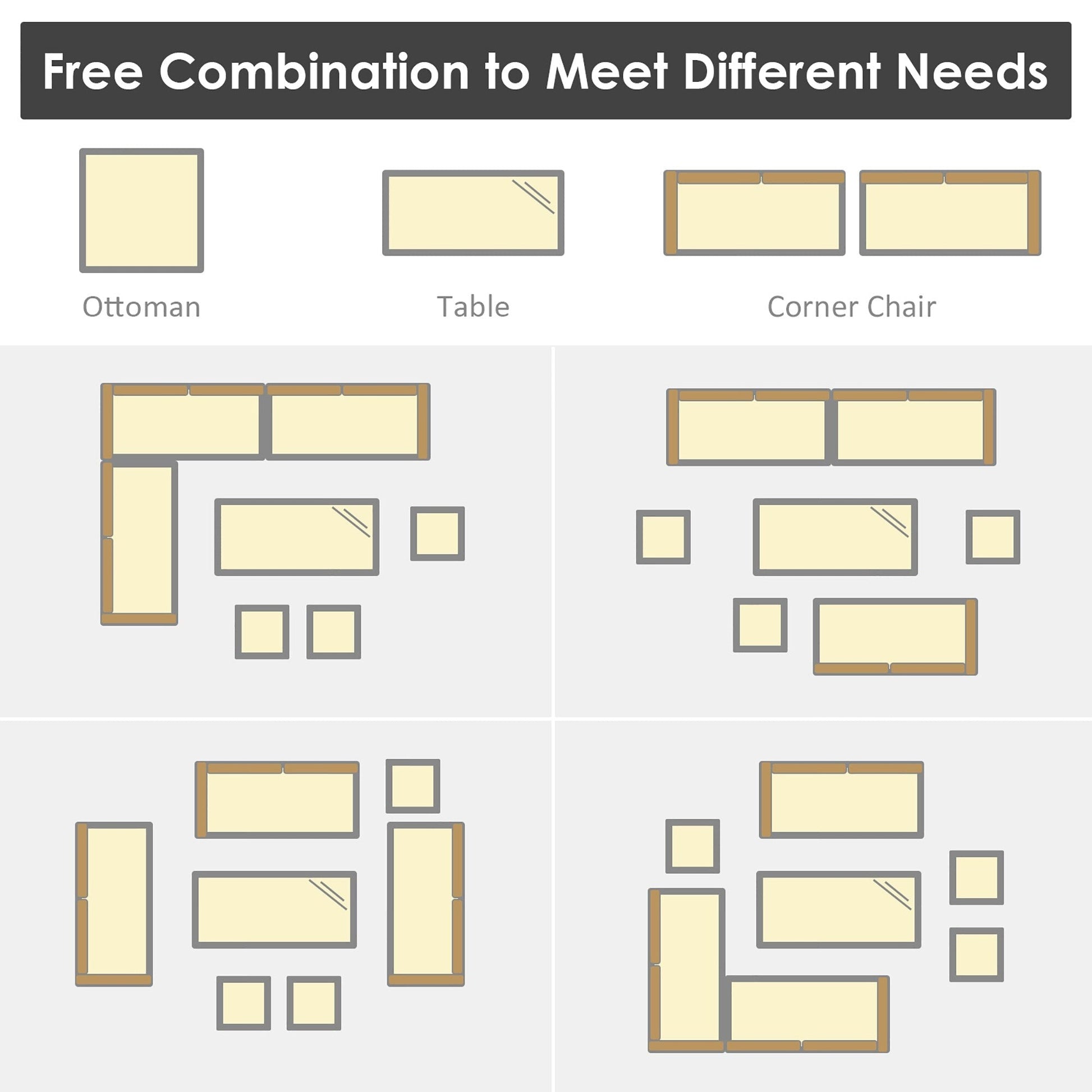 Il nostro set di divani in rattan da 7 pezzi è composto da 3 sedie angolari, 1 tavolo e 3 pouf, che creeranno un'area salotto esterna super confortevole e spaziosa per te e la tua famiglia. Ogni pezzo di questo set può essere utilizzato singolarmente o in combinazione, in base alle tue esigenze. Grazie alla robusta struttura in acciaio e al vimini in PE resistente alle intemperie, questo set di mobili da giardino è robusto e stabile, garantendo una lunga durata. Gli spessi cuscini imbottiti in spugna offrono un comfort ottimale. Dotati di cerniere, i rivestimenti dei cuscini sono facili da rimuovere e pulire. Il tavolo da pranzo abbinato, con un ampio piano in plastica e legno, è perfetto per appoggiare bevande e cibo mentre ti rilassi al sole. Inoltre, questi moderni mobili in vimini sono perfetti per qualsiasi spazio esterno, inclusi cortili, patii, giardini, portici o interni, se lo desideri.