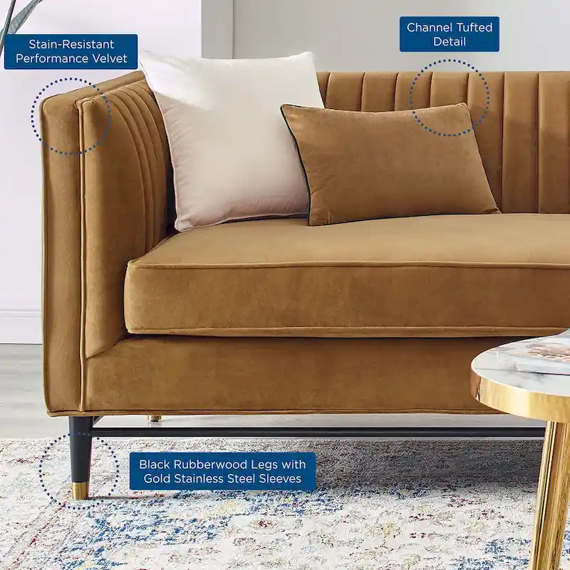 Introduci le linee fluide del divano Devote Channel Tufted Performance Velvet nell'arredamento del tuo soggiorno, camera da letto o ufficio. Con un tocco retrò alla classica trapuntatura, questo divano è arricchito da una trapuntatura a canali verticali che aggiunge profondità visiva e un tocco glamour in stile déco a qualsiasi spazio. Questo divano da soggiorno è rivestito in velluto tecnico antimacchia e imbottito in schiuma densa per un'esperienza di seduta di alta qualità. Realizzato con cura, questo divano poggia su gambe in legno di caucciù nero con inserti in acciaio inossidabile dorato che aggiungono un tocco di sobrietà. Include piedini antitraccia. Montaggio richiesto. Capacità di carico del divano: 590 kg.