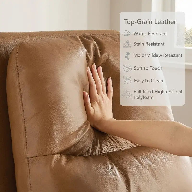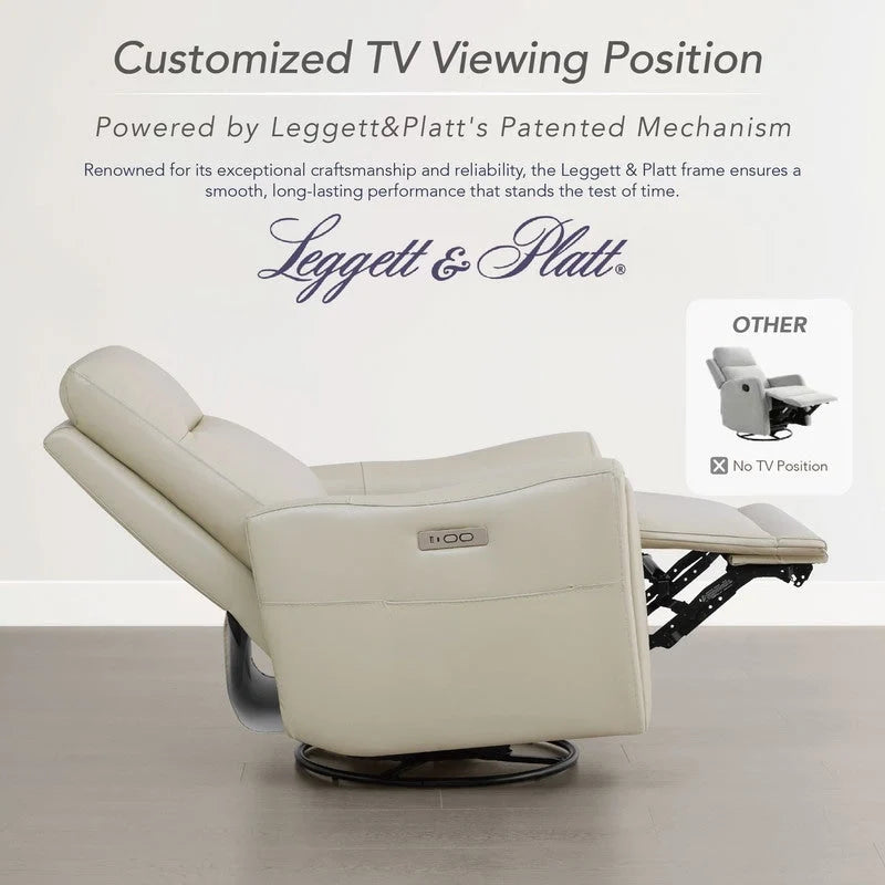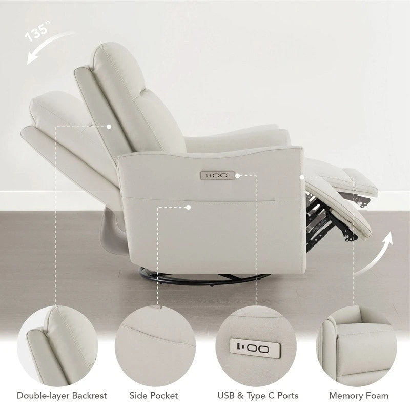 Migliora il tuo comfort con la nostra poltrona reclinabile girevole elettrica, perfetta per il soggiorno, la cameretta dei bambini o l'home theater. Questa moderna poltrona reclinabile in pelle è dotata di una rotazione fluida a 270°, un delicato movimento di scorrimento e una facile reclinazione elettrica per un relax personalizzato. Ideale come poltrona reclinabile per la cameretta dei bambini o come seduta per l'home theater, offre una morbida seduta in memory foam e vera pelle dove serve, per una finitura morbida e facile da pulire. Progettata per l'uso quotidiano, include due porte USB/Type-C, tasche laterali e un robusto meccanismo Leggett & Platt che supporta fino a 150 kg. Una poltrona reclinabile girevole elegante e salvaspazio, pensata per gli adulti che desiderano funzionalità, comfort e praticità in un'unica elegante poltrona.