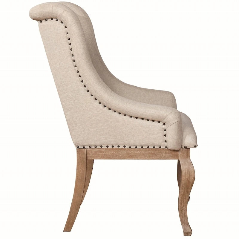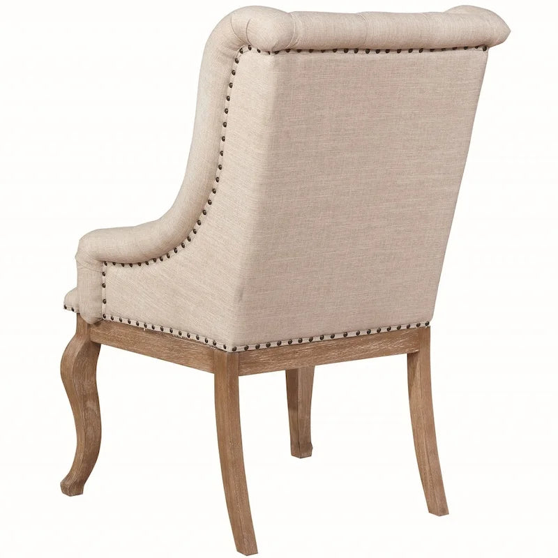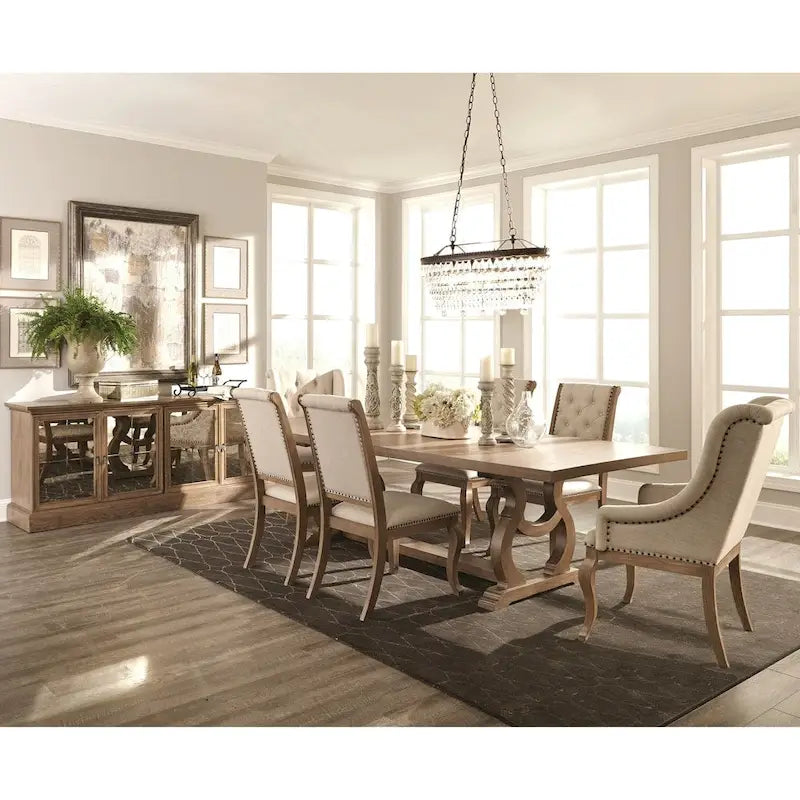Questo splendido set da pranzo si ispira al design neoclassico francese del XVIII secolo. Il tavolo è realizzato in legno massello con finitura marrone orzo. Il tavolo presenta uno spesso piano in legno massello e una prolunga rimovibile da 50 cm che estende il tavolo da 213 a 263 cm, consentendo di ospitare più persone e ospiti, mentre i doppi piedistalli dalla forma architettonica offrono uno stile moderno ma classico. Le sedie laterali e le poltrone complementari sono rivestite in un tessuto color crema effetto lino, elegante e resistente, con dettagli trapuntati a bottoni. Piccole borchie applicate a mano impreziosiscono queste sedie per esaltarne lo stile ricco. Questo set ha abbastanza carattere da riscaldare la stanza e diventare senza sforzo il punto focale della zona pranzo.