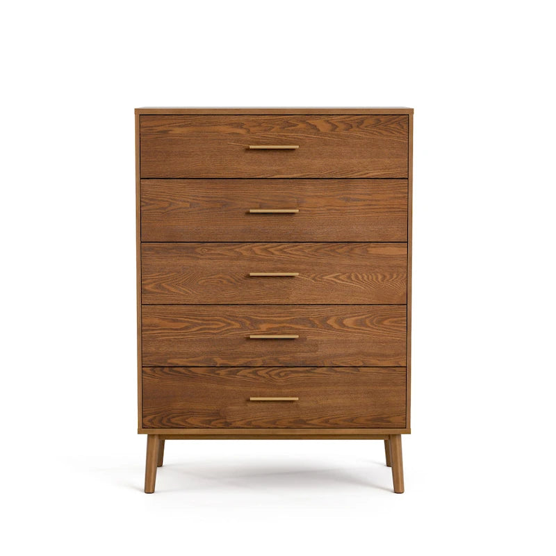 Valorizza la tua camera da letto con la nostra cassettiera moderna in legno di caucciù di metà secolo, realizzata in massello di legno di caucciù e rifinita in pregiato noce. Dotata di cinque ampi cassetti con un sicuro sistema di blocco antiribaltamento ed eleganti maniglie a barra in nichel, questa cassettiera unisce un design senza tempo a una pratica funzionalità. Le eleganti gambe affusolate e la struttura resistente la rendono un'aggiunta elegante e duratura a qualsiasi casa moderna.