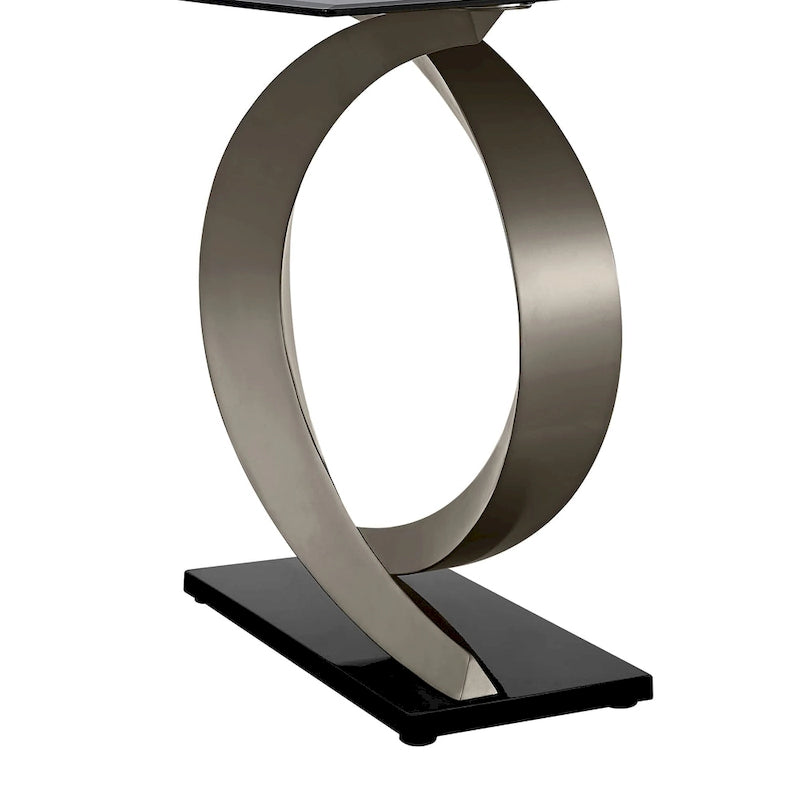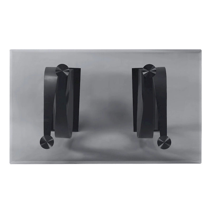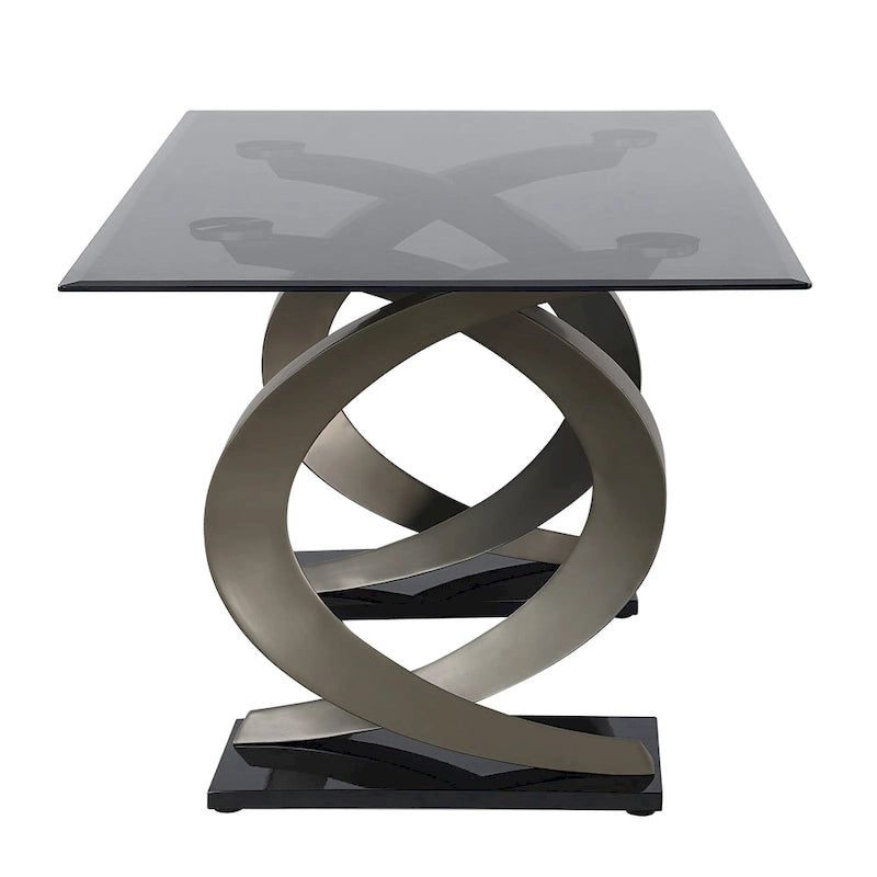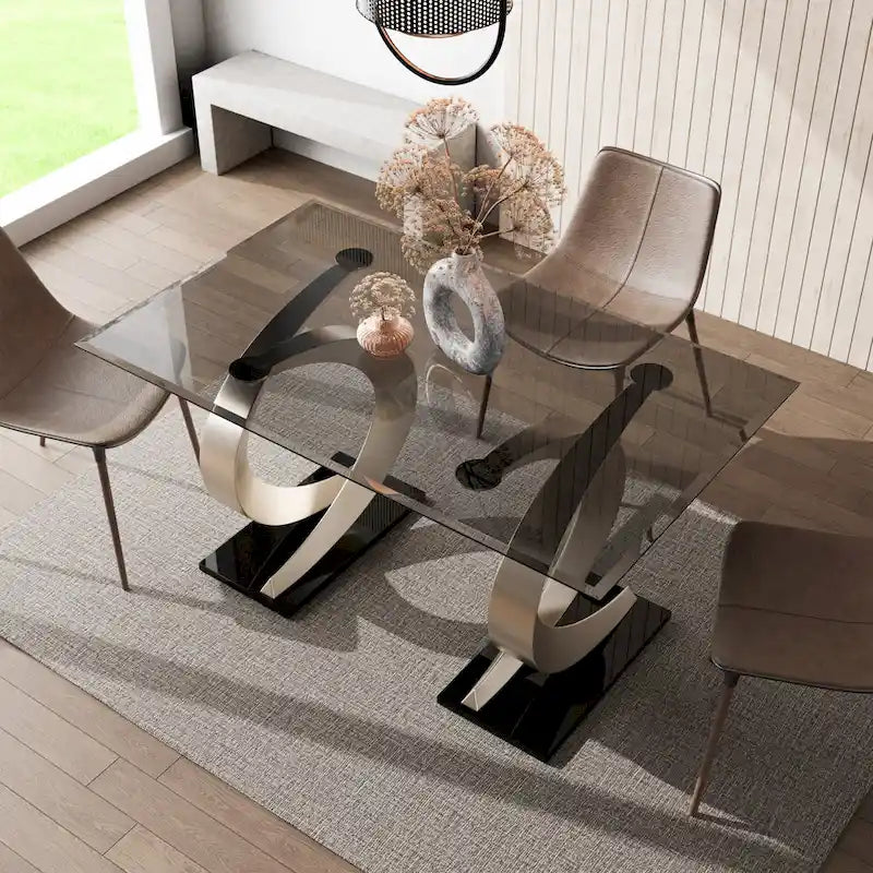 Lasciatevi conquistare dal design moderno e accattivante di questo sofisticato tavolo da pranzo in vetro scultoreo. Abbina il vetro temperato grigio a una base a doppio piedistallo con curve a C sovrapposte in finitura champagne, per un look raffinato e un'atmosfera suggestiva.