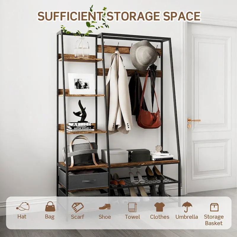 Cerchi un appendiabiti versatile per organizzare al meglio i tuoi oggetti? Il nostro appendiabiti multifunzionale sarà la soluzione perfetta. Dispone di 9 ganci doppi, ripiani a 6 livelli, 2 cassettiere pieghevoli, 1 panca portascarpe e una scarpiera a 2 livelli, che ti permettono di appendere o riporre cappelli, borse, vestiti, scarpe e altro ancora. Inoltre, puoi sederti sulla panca per cambiarti comodamente le scarpe o usarla come un normale ripiano portaoggetti. Se hai bisogno di più spazio per esporre i tuoi soprammobili, puoi facilmente rimuovere i cassetti in tessuto. Inoltre, il nostro appendiabiti è realizzato in acciaio massiccio e legno ingegnerizzato, materiali robusti e resistenti per durare a lungo per te e la tua famiglia.