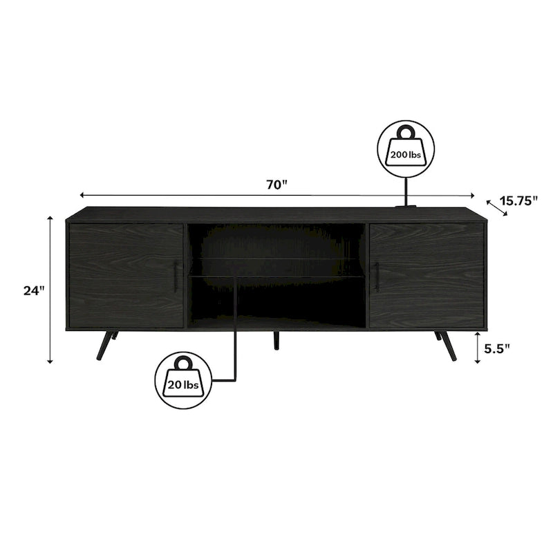 Migliora la tua esperienza di visione TV con l'elegante e funzionale mobile porta TV Mid-Century Modern da 70 pollici di Middlebrook Designs, che può ospitare la maggior parte dei televisori a schermo piatto fino a 80 pollici. Questo mobile vanta una resistente struttura in MDF e laminato con gambe affusolate in metallo e presenta un ripiano in vetro temperato, due ante con ripiani interni e un ampio piano d'appoggio. Con quattro splendide opzioni di finitura tra cui scegliere, questo mobile si adatta sicuramente a qualsiasi arredamento. Questo mobile porta TV include anche fori preforati per la gestione dei cavi per una configurazione ordinata.
