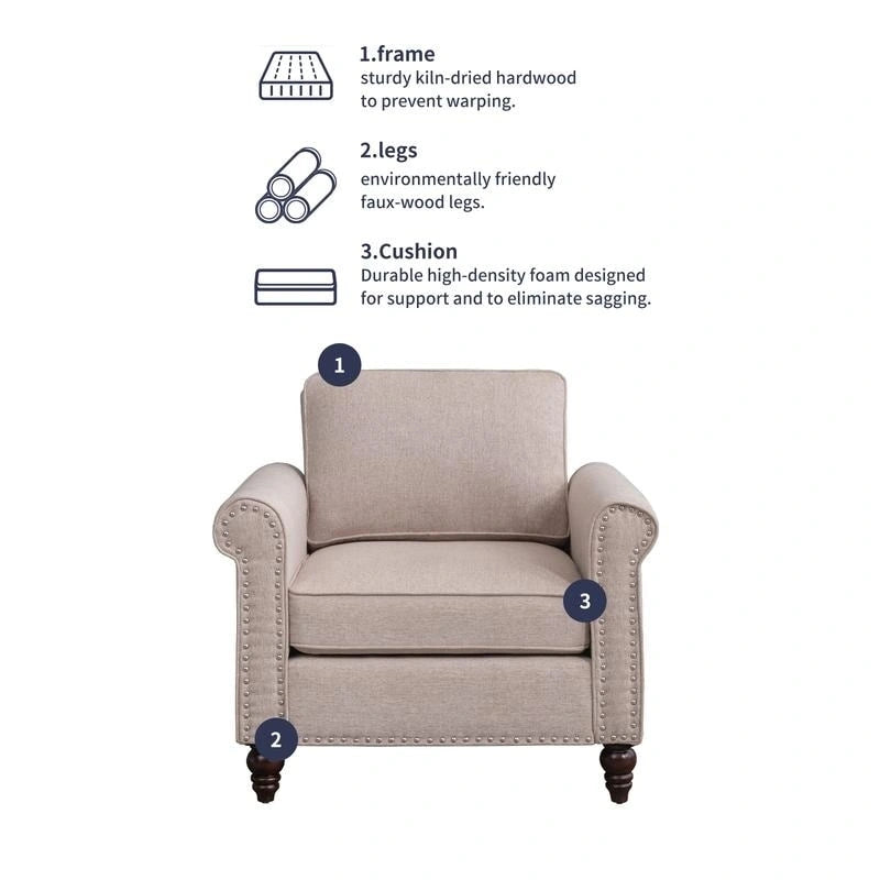 Struttura robusta e durevole: l'intera struttura del divano è realizzata in legno massello di alta qualità e ogni giunto è rinforzato con rivetti per evitare un facile collasso, molto robusto e durevole. Anche le gambe del divano sono realizzate in legno massello, molto stabile e con un certo grado di proprietà antiscivolo, che impedisce facili vibrazioni.