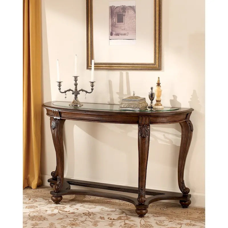 Porta un elegante stile tradizionale nel tuo soggiorno con il delizioso tavolino da divano Norcastle di Ashley Furniture. Questo tavolino è caratterizzato da una struttura in legno massello e da splendide gambe tornite, con un centro in vetro bisellato che poggia su una struttura in metallo fuso a filigrana.