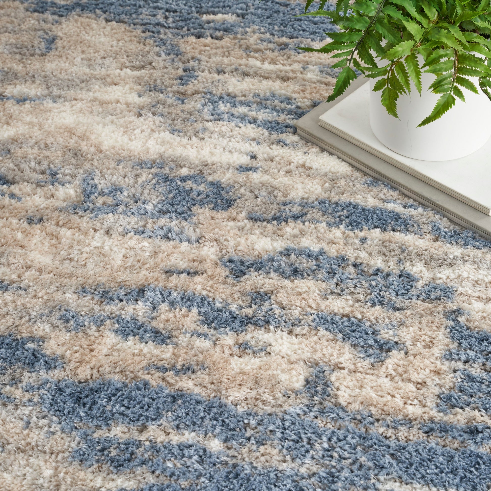 Porta un senso di tranquillità nella tua casa con la morbida texture di questo tappeto a pelo lungo della collezione Luxurious Shag. Nei toni neutri dell'avorio e del blu, si abbina perfettamente a una varietà di stili moderni e contemporanei. Realizzato in poliestere meravigliosamente morbido, con un pelo spesso di 3,7 m.
