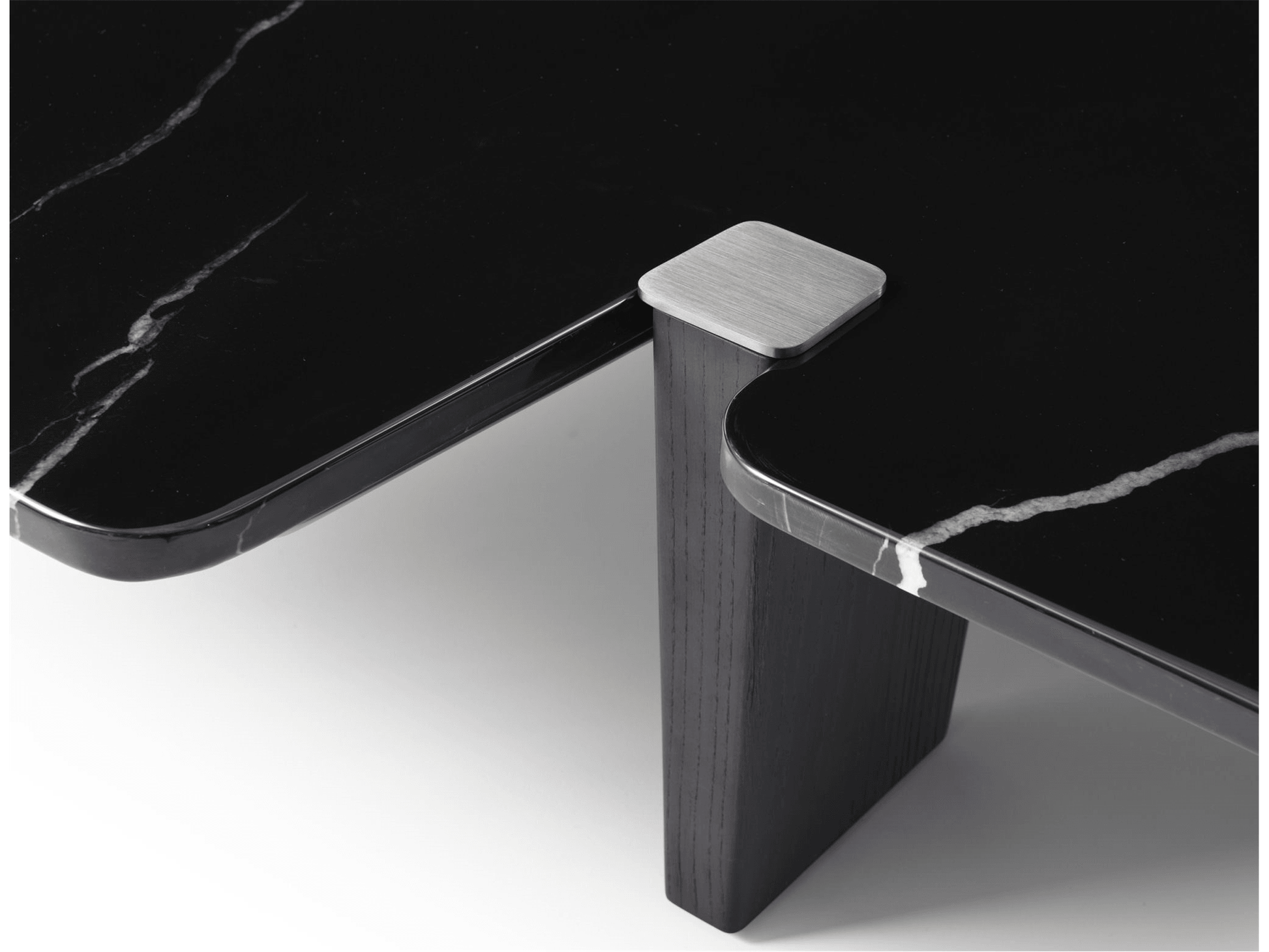 Il tavolino Pickle è dotato di piano in marmo nero, piedini in acciaio inossidabile spazzolato e base in rovere affumicato.