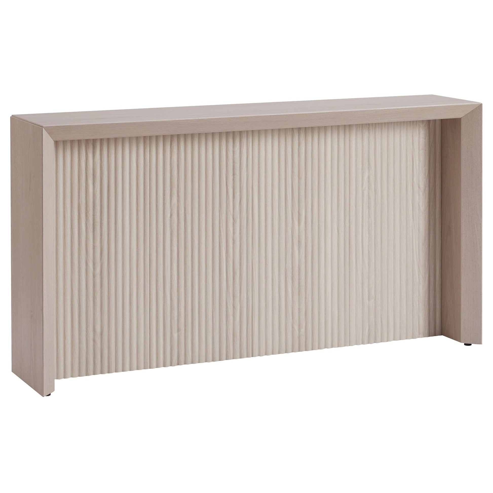 Colpisce per la sua semplicità, questo moderno tavolo consolle enfatizza linee pulite e un design lineare. Il design senza soluzione di continuità del tavolo è ulteriormente arricchito dalla bordatura smussata lungo i bordi, mentre il retro scanalato crea uno sfondo strutturato. La finitura effetto legno naturale aggiunge una variazione tonale di tendenza al tuo spazio. Facile da montare, questo è il pezzo perfetto per rinnovare senza sforzo il tuo soggiorno, soggiorno o ufficio.