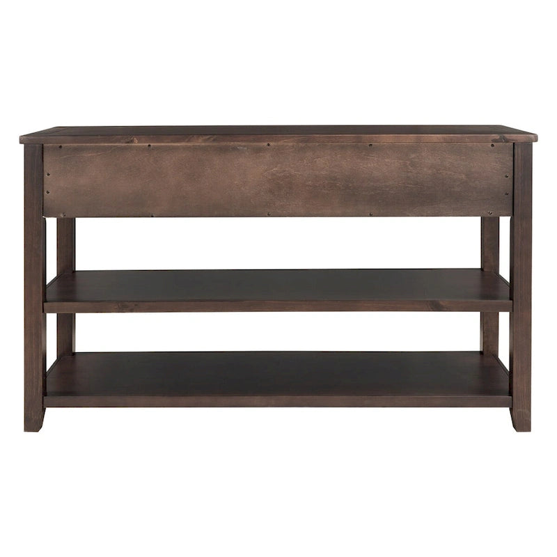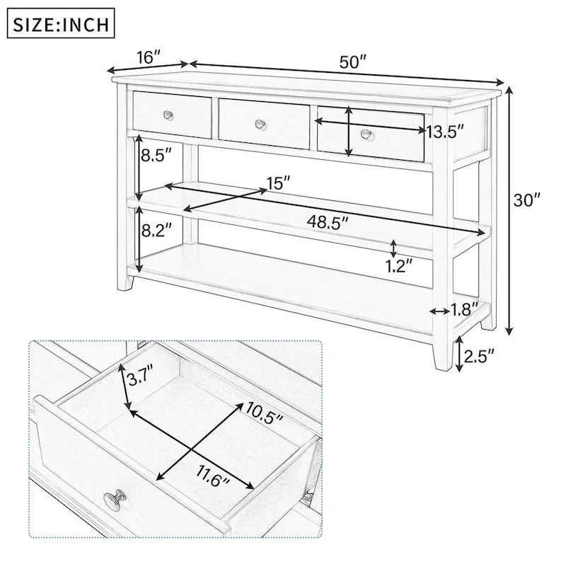 Questo tavolo consolle dal design retrò con due ripiani aperti porta un'atmosfera di metà secolo nella tua casa con il suo design classico, le linee semplici e pulite e le maniglie circolari. Il design aperto si allinea sia con l'estetica retrò che con la praticità d'uso, evidenziando una struttura ordinata che trasuda un fascino raffinato e dignitoso. Il tavolo è dotato di tre cassetti e due ripiani aperti, offrendo ampio spazio per riporre oggetti di uso quotidiano, libri o oggetti decorativi. Realizzato con una solida struttura in legno di pino e pannelli in MDF, questo tavolo consolle garantisce stabilità, durata e una sensazione di morbidezza al tatto. È un pezzo ideale per qualsiasi soggiorno, corridoio o ingresso. Caratteristiche: