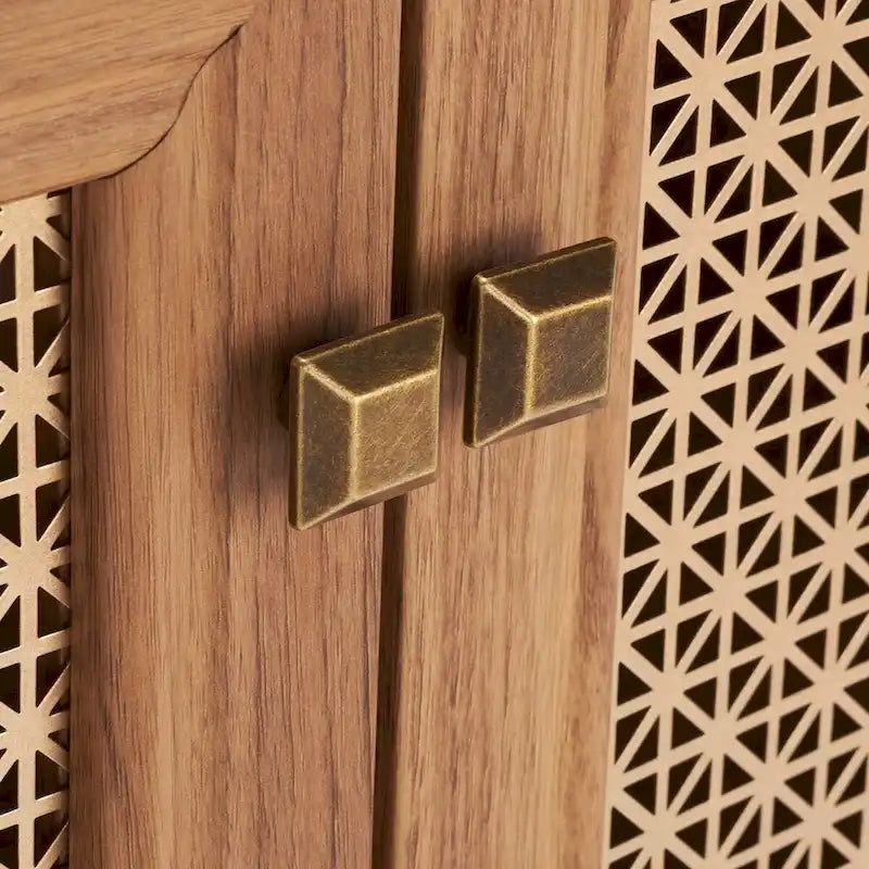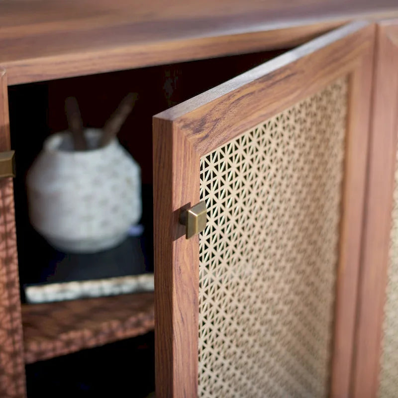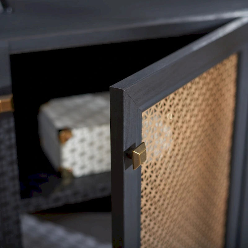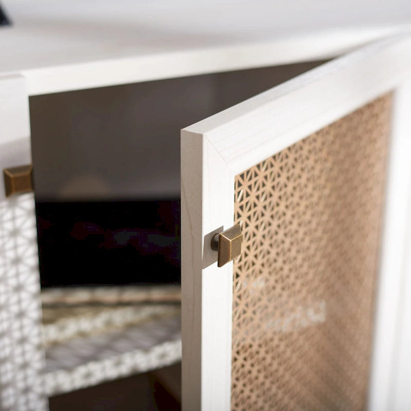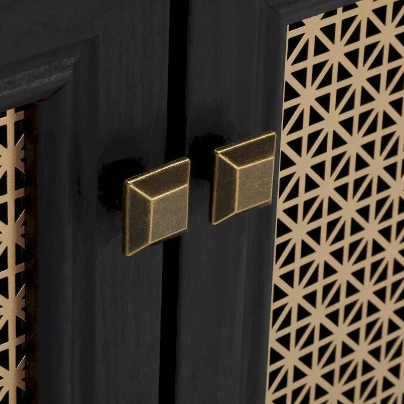 Lo splendore tradizionale incontra l'eleganza contemporanea in questo mobile porta TV. Le quattro ante rifinite di Piran sono impreziosite da una rete a maglie dorate che crea un contrasto artistico e crea un punto focale decorativo di grande impatto in qualsiasi area dedicata all'intrattenimento, mentre i due ripiani offrono ampio spazio di archiviazione.