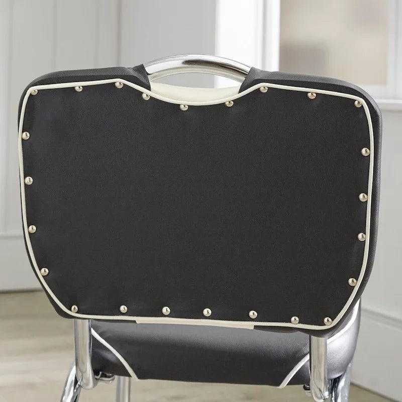 Le sedie da pranzo retrò Raleigh di Simple Living si ispirano al design Mid-Century che un tempo si trovava nelle gelaterie e nei ristoranti americani. Sono realizzate con le caratteristiche gambe cromate e rivestimento in similpelle con ampia imbottitura sottostante. Scegli tra due (2) colori vintage, rosso o nero, ognuno caratterizzato da una striscia bianca a contrasto al centro dello schienale e da un dettaglio a borchie sul retro. Una maniglia cromata completa il look retrò, offrendo al contempo una maggiore maneggevolezza. Set di due (2).