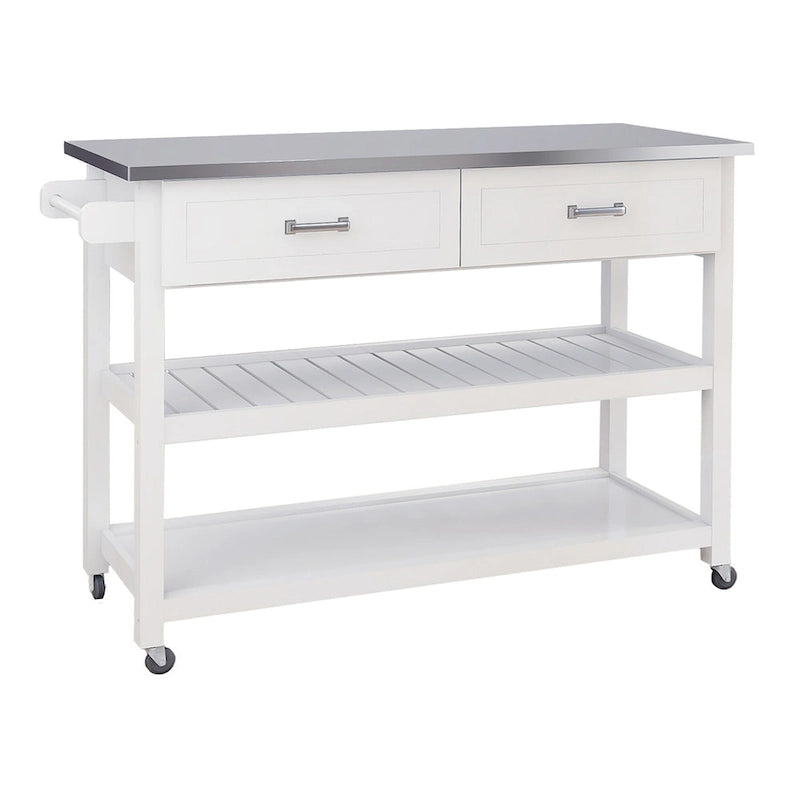 Carrello da cucina bianco con piano in acciaio inox e due cassetti (sgabello non incluso)