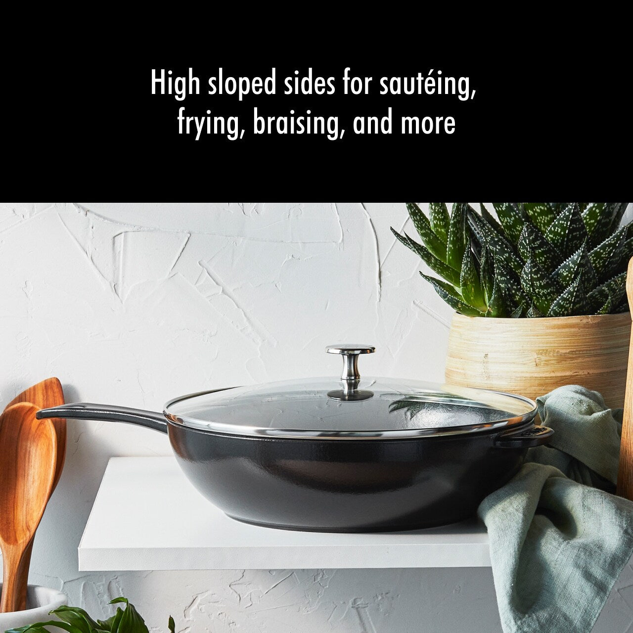 Questa padella da 2,9 litri con coperchio in vetro temperato è il massimo multiuso in cucina. I suoi bordi alti e inclinati la rendono ideale per rosolare, friggere, brasare e molto altro, ed è perfetta per piatti che vengono rosolati sui fornelli e rifiniti in forno. Il coperchio in vetro spesso trattiene l'umidità, garantendo risultati saporiti e consentendo di monitorare comodamente la cottura senza rimuovere il coperchio. La ghisa possiede eccezionali qualità di ritenzione del calore, quindi la padella si riscalda in modo uniforme. E quando è il momento di servire, puoi portare questa elegante padella direttamente in tavola.