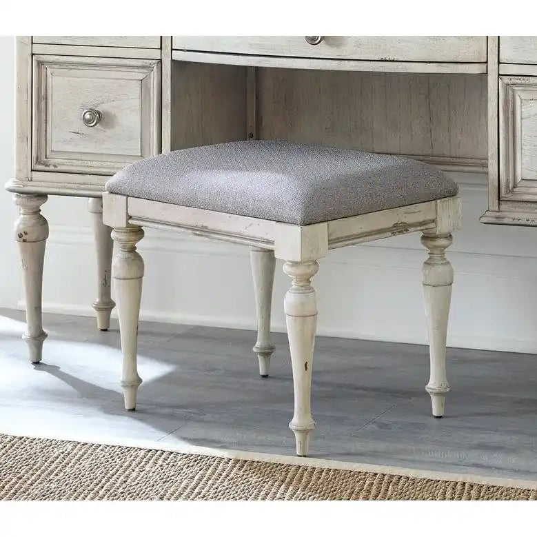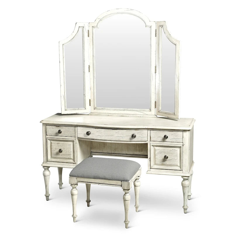 L'elegante stile rustico vintage si esprime in questo set da toeletta con grazioso specchio ad arco e cerniera, scrittoio e sgabello con splendide gambe tornite e finitura a scelta in legno di deriva rustico anticato o avorio. Cinque cassetti portaoggetti e splendide gambe tornite aggiungono fascino classico a questo set.