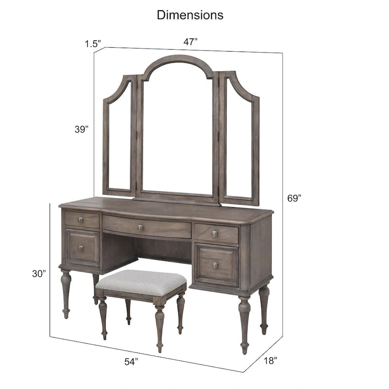 - Dimensioni della scrivania e dello specchio: 69 pollici di altezza x 54 pollici di larghezza x 18 pollici di profondità