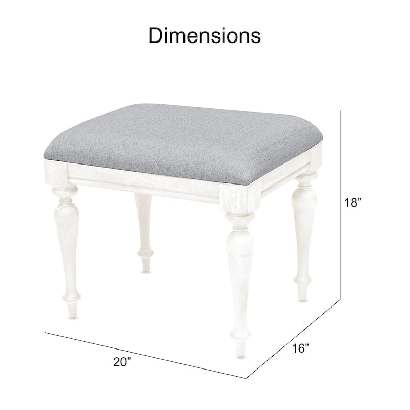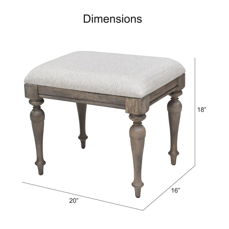 - Dimensioni dello sgabello da toeletta: 18 pollici di altezza x 20 pollici di larghezza x 16 pollici di profondità